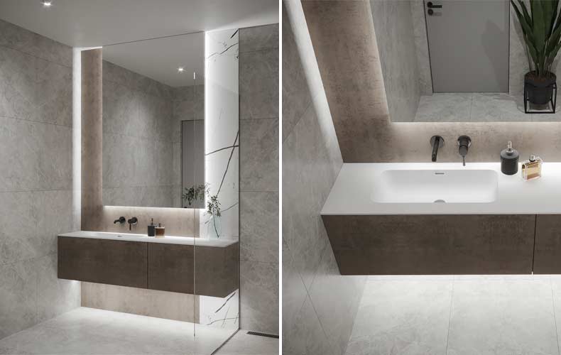 Эффект, при котором предметы мебели будто парят в воздухе, визуально раздвигает границы помещения и облегчает интерьер. Для усиления эффекта внизу под полками, столешницей, тумбой устанавливается дополнительная подсветка. Сантехника также по возможности выбирается навесная. Такое решение делает интерьер воздушным и одновременно избавляет его от инженерных коммуникаций, которые скрываются внутри тумб и шкафов.
