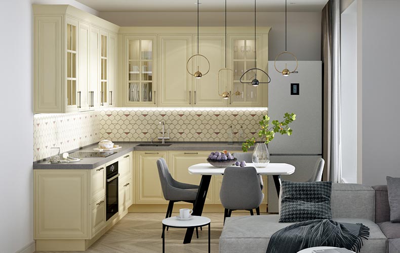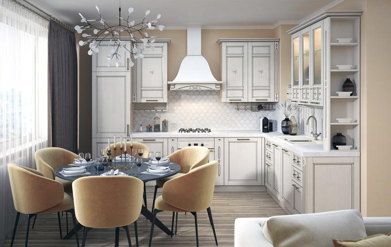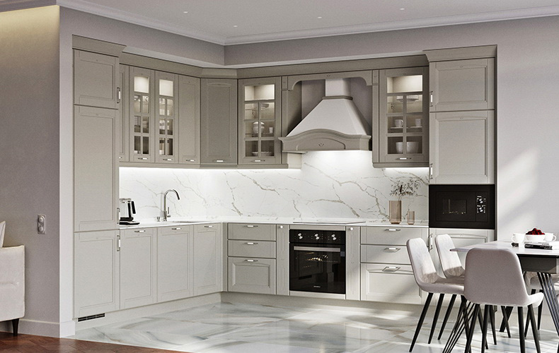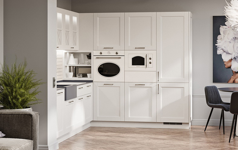 Для этого стиля характерны натуральные светлые тона без ярких оттенков, матовые фасады, часто с эффектом старения, и прямые линии, разбавленные изогнутыми элементами, фигурными карнизами и фрезеровкой. В прованс отлично вписываются угловые кухни как с прямым, так и с трапециевидным шкафом под мойку.