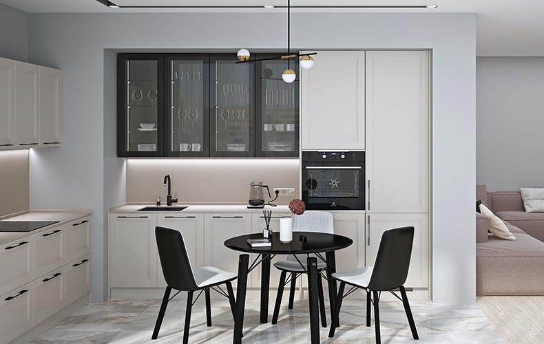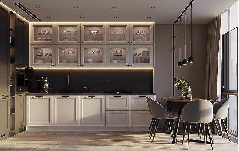 - Кухня под потолок. Стильное и одновременно практичное решение: разместить верхние шкафы до самого потолка. Это не только увеличит пространство для хранения, но и сделает интерьер более солидным и законченным.