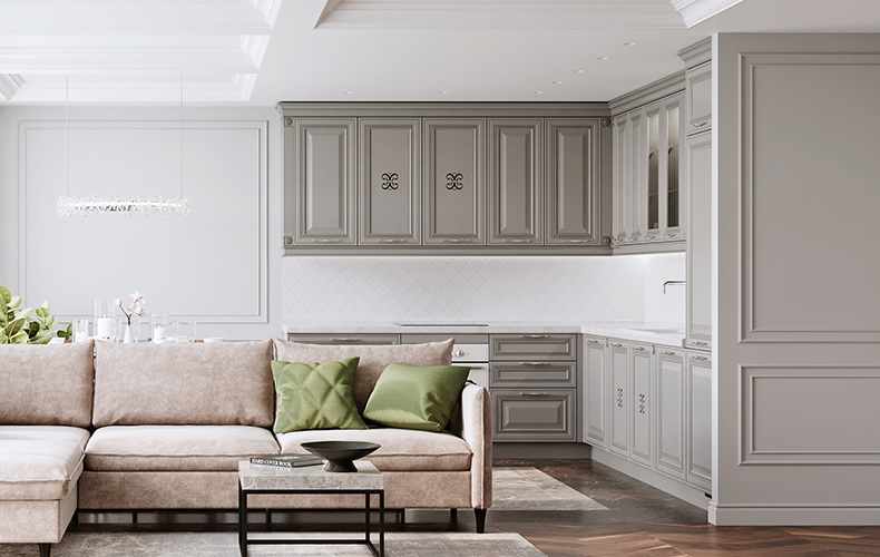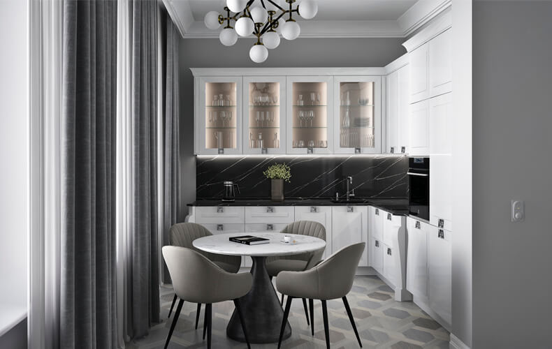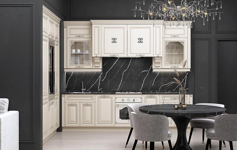 Цветовая гамма классических кухонь — это натуральные цвета без ярких оттенков. Особенно роскошным внешним видом могут отличаться белые варианты. Прекрасно вписываются в интерьер бежевый, черный, серый, и даже пастельные синий и зеленый цвета.