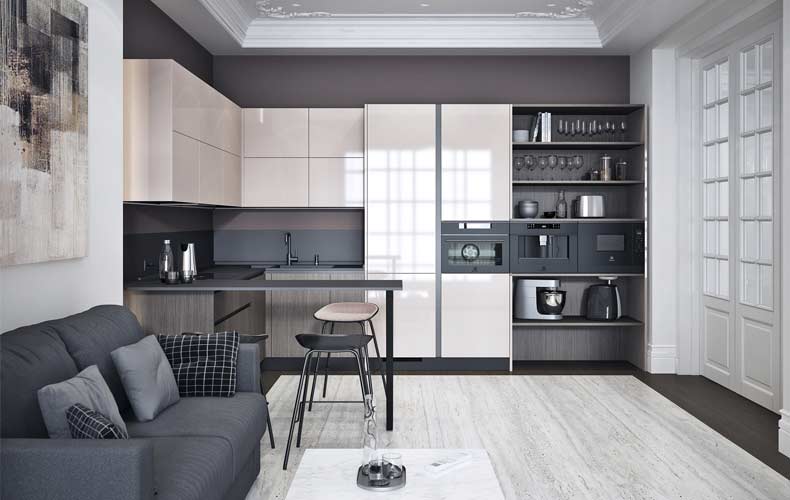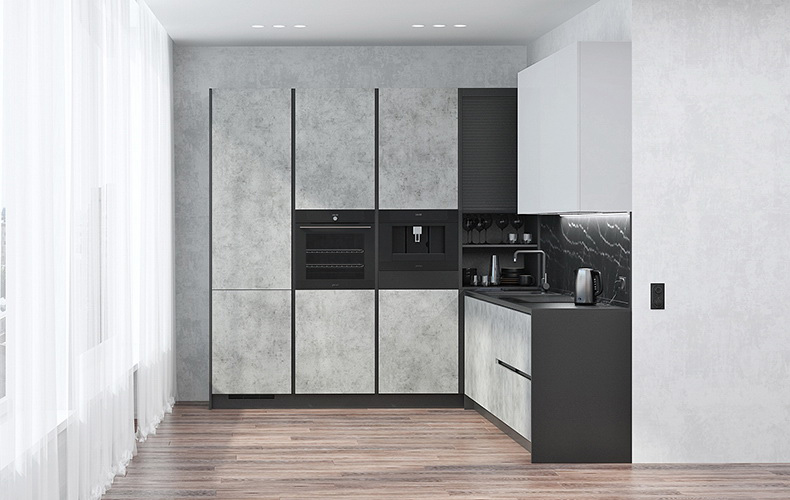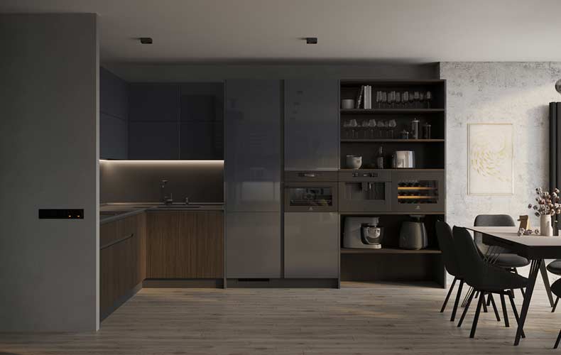 - Высокие модули для техники. Удобство эксплуатации — важнейший показатель качества кухни. Подъем техники на удобный для использования уровень — одно из актуальных решений, направленное на практичность. Так, например, духовой шкаф, размещенный на уровне столешницы, гораздо удобнее в эксплуатации, чем установленный под ней.