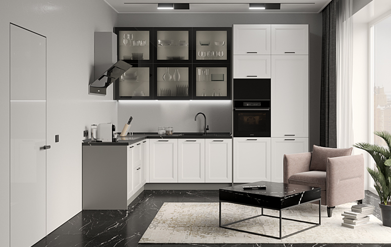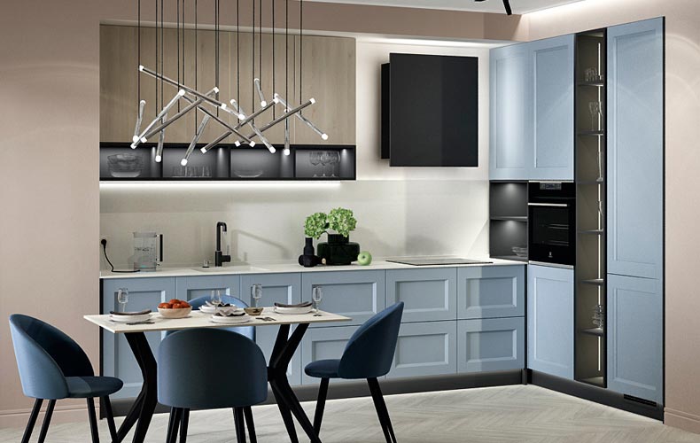 Угловой гарнитур — популярное решение для кухонь в большинстве интерьерных стилей. Он позволяет сформировать удобный рабочий треугольник, спроектировать функциональное пространство для хранения с удобным доступом, и эффективно использовать площадь как небольшой, так и просторной кухни.