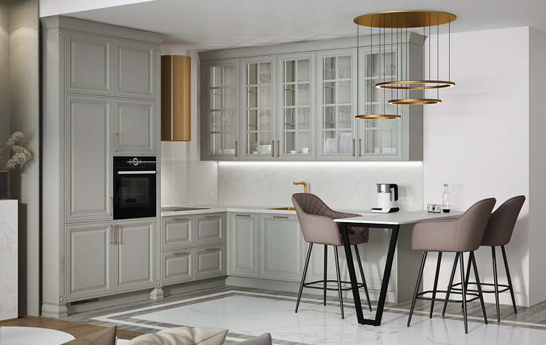 Классика — это неприкрытая роскошь с легким налетом старины. Прямые фасады, украшенные элегантной фрезеровкой, фактурные карнизы и стилизованная под винтаж техника создают на кухне интерьер, достойный дворца. Классическая угловая кухня чаще собирается с прямым углом, однако встречаются и скошенные модели.