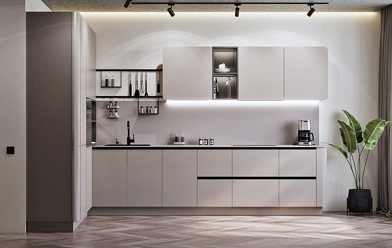 Современный стиль основан на сочетании простоты и практичности использования. Главный его атрибут — качественная современная фурнитура. Фасады у таких кухонь обычно прямые, без изгибов и фрезеровок. В современный стиль хорошо вписываются как матовые, так и глянцевые покрытия. Такой интерьер не любит излишнего декора, однако полностью развязывает руки при выборе цвета: современные кухни могут гармонично выглядеть практически в любой расцветке.