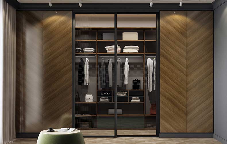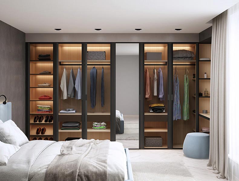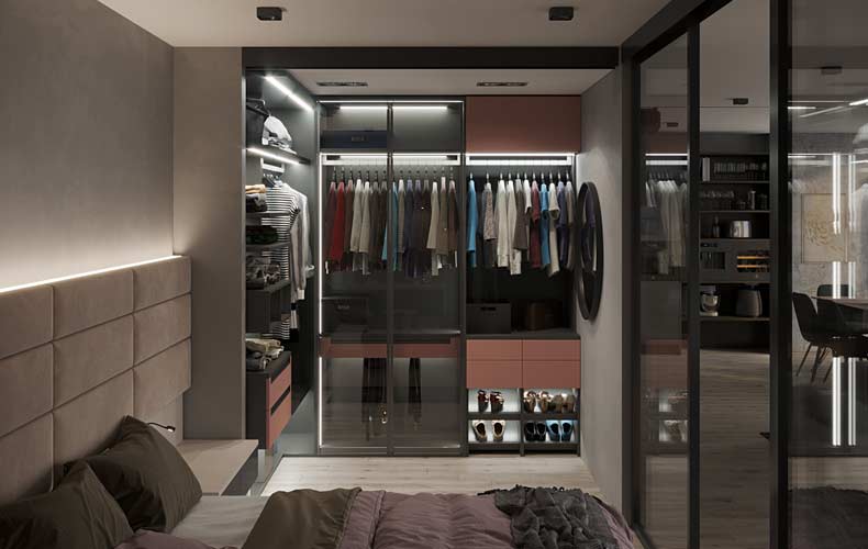 Подходит для маленьких и темных спален, в которых часто возникает ощущение захламленности. Эффект скрытого хранения помогает сделать спальню просторнее. Подсветка внутри гардеробной станет источником приглушенного теплого света вечером и поможет визуально облегчить интерьер.
