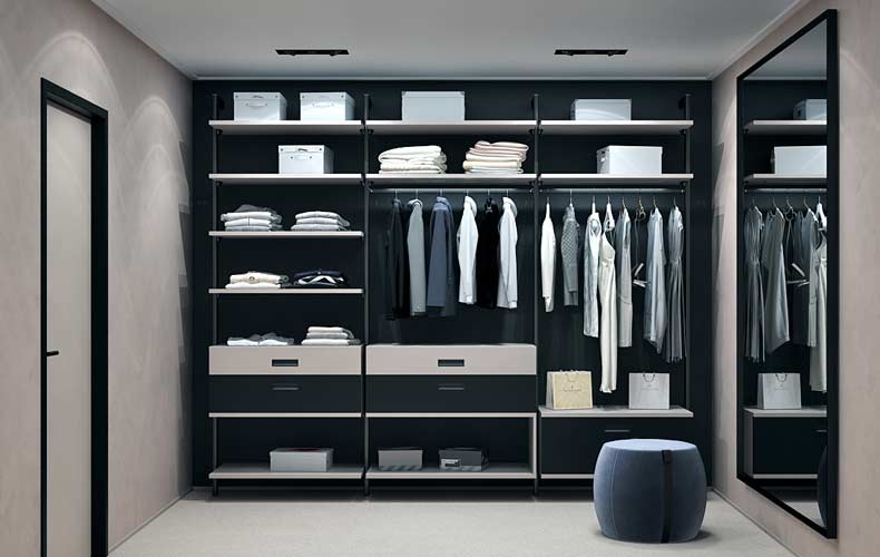 В открытых пространствах-студиях важно зонирование. Гардеробная может быть выделена с помощью мобильных перегородок или стационарных конструкций.