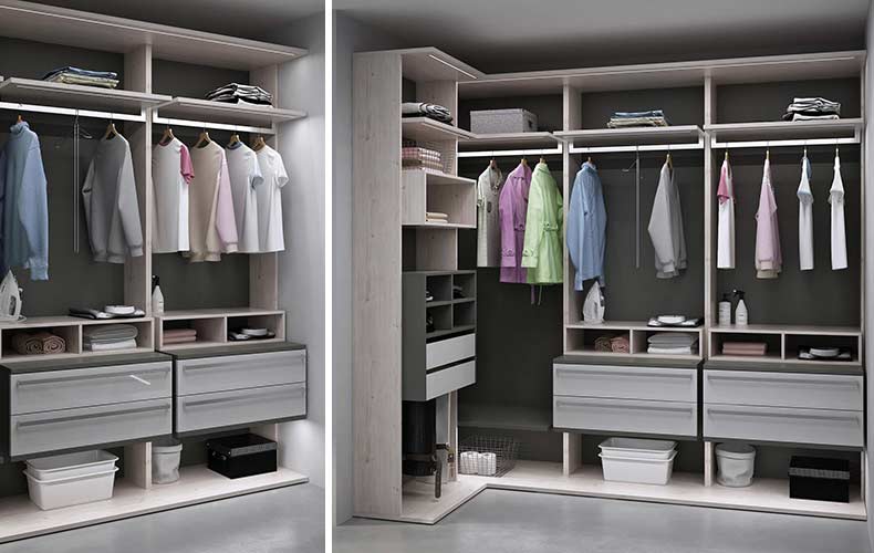 - Организуем параллельное хранение, если спальня для двоих — гардеробную, в отличие от шкафа, легко организовать симметрично, что удобно для пары.