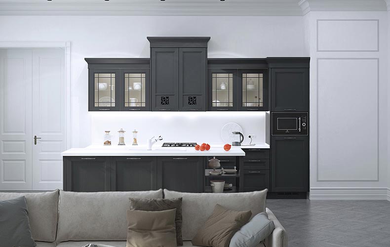 Строгие классические кухни часто делают в оттенках темного драгоценного дерева. Неоклассика же удобна тем, что ее цветовой диапазон может быть еще больше расширен. Например, неоклассические кухни отлично смотрятся в модном матовом графитовом или темно-синем цвете.