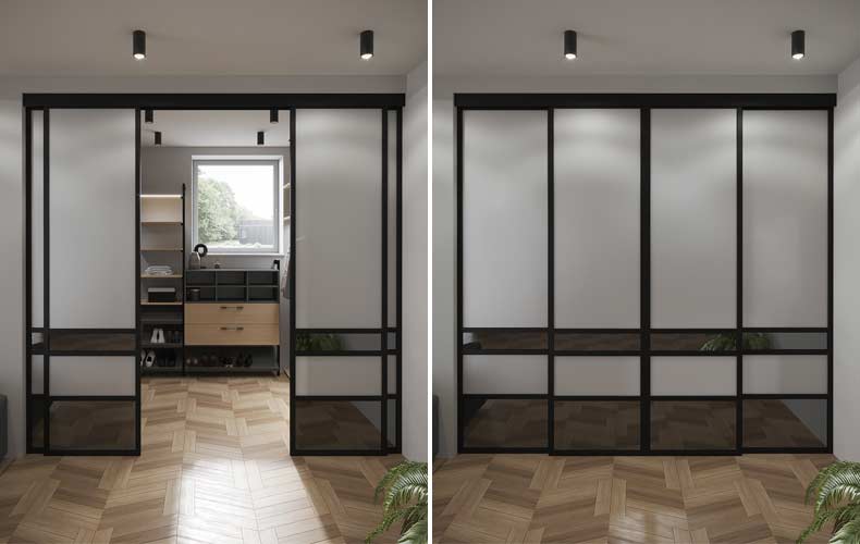 Позволяют менять планировку в зависимости от нужд обитателей квартиры, и отвечают тренду современного дизайна на многофункциональность и способность к трансформации. Хорошая альтернатива обычным дверям, при этом площадь помещения используется более рационально благодаря раздвижным конструкциям. Индивидуальное проектирование перегородок позволяет варьировать высоту, ширину полотна перегородок и материал, из которого они изготовлены. Например, перегородки из МДФ или ЛДСП обеспечивают достаточную приватность каждой зоны, а прозрачные и тонированные стеклянные панели сохраняют достаточную освещенность всех уголков комнаты. Раздвижные перегородки можно использовать, например, для обособления ниши под гардеробную комнату.