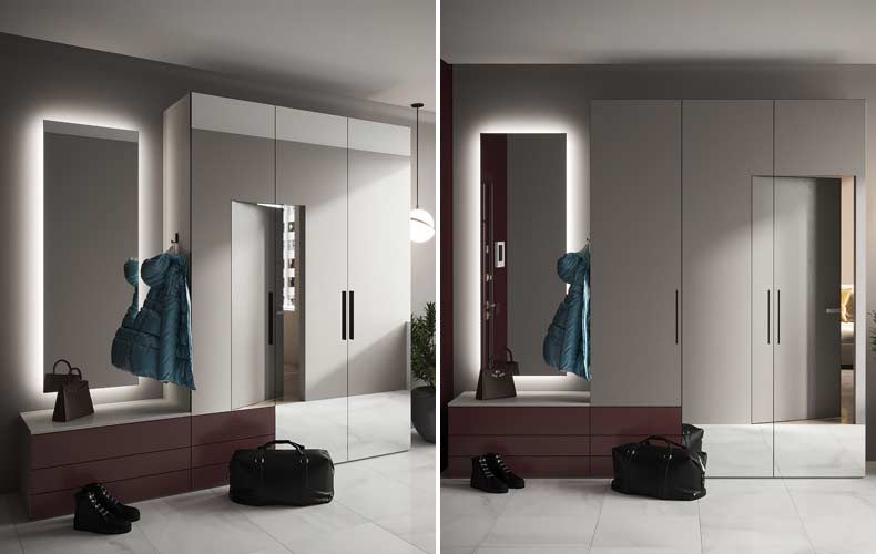 Одной из примет минималистичных интерьеров стало отсутствие видимых источников света в прихожей или ванной. При этом зеркало — обязательный атрибут такого помещения — становится источником рассеянного света.