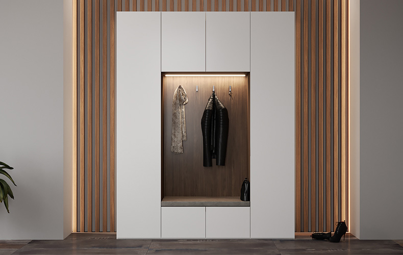 — Самый очевидный пример совмещения открытых полок и закрытых шкафов — любая прихожая. Чаще всего открытые полки предназначены для хранения головных уборов, повседневной обуви и одежды, перчаток, сумочек. Обязательно есть полочка, куда при входе можно бросить телефон и ключи. Закрытый шкаф проектируется для верхней одежды, хранения обуви, сезонных вещей.