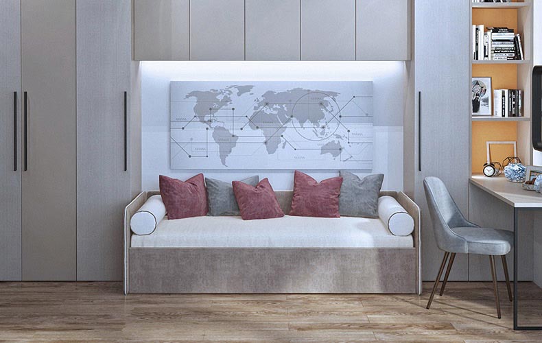 Спальное место дивана-кровати изготавливается необходимой длины под размеры матраца 190см или 200см и шириной в трех размерах 80см, 90см и 120см на выбор. Также для дивана можно заказать подъемный механизм.
