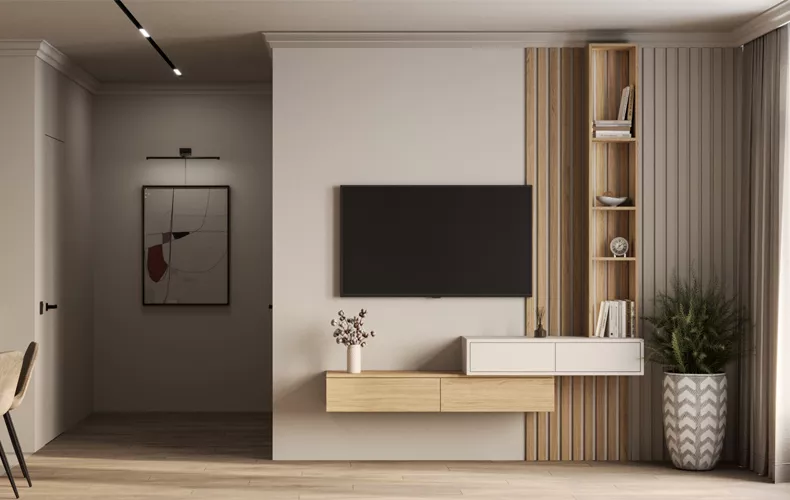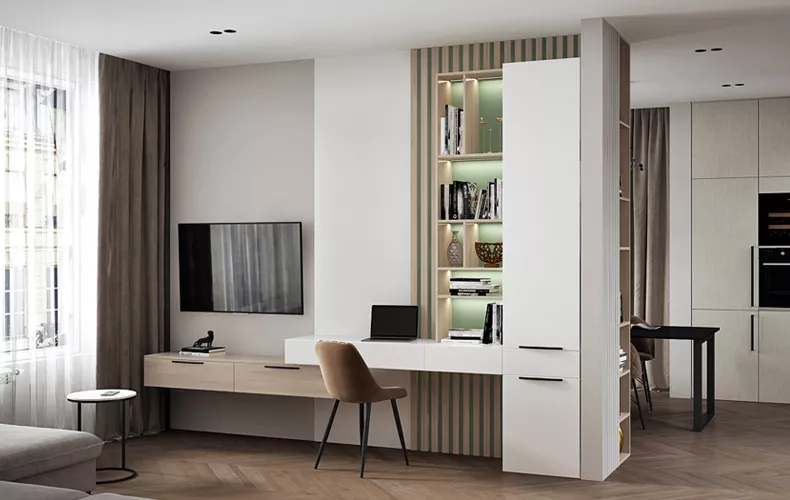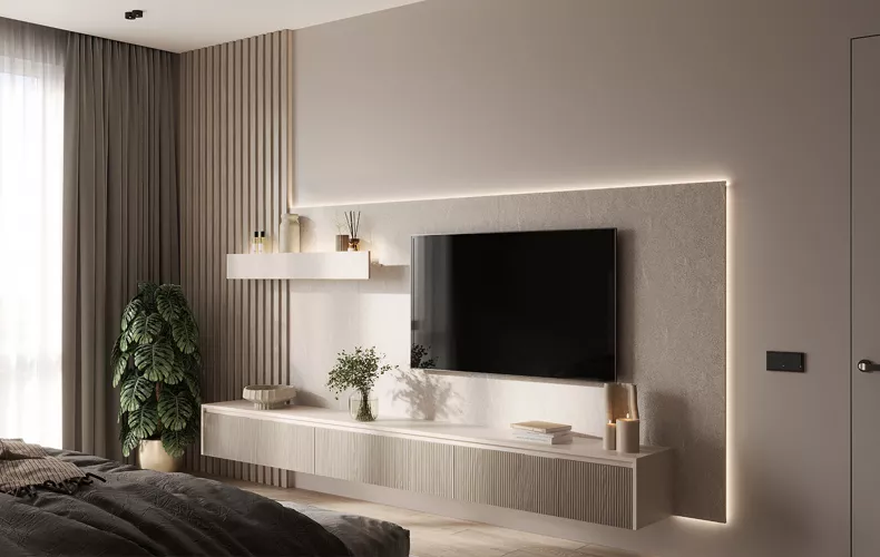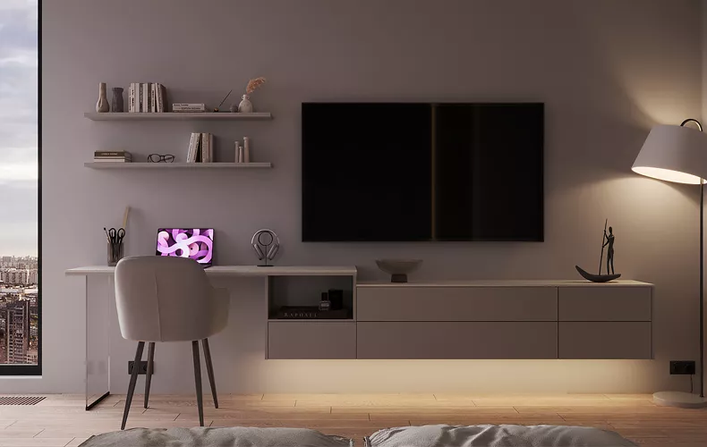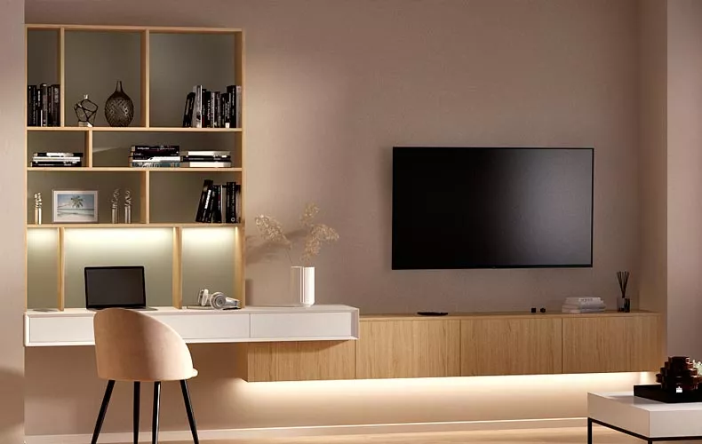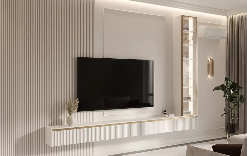 Мебель для гостиной 6 представлена высоким встроенным шкафов витриной и секцией с навесной тумбой под ТВ. Локальная подсветка и декоративная панель дополняют гостиную в современном стиле.