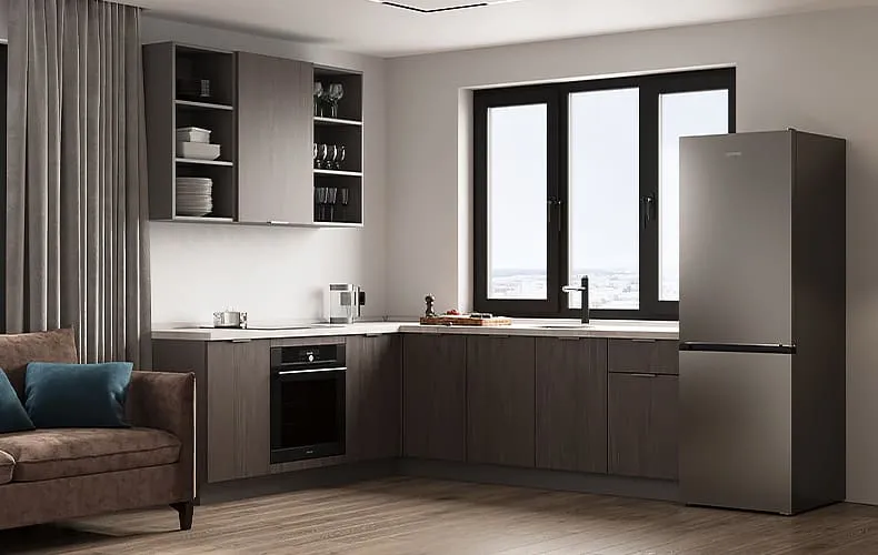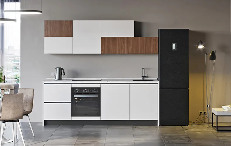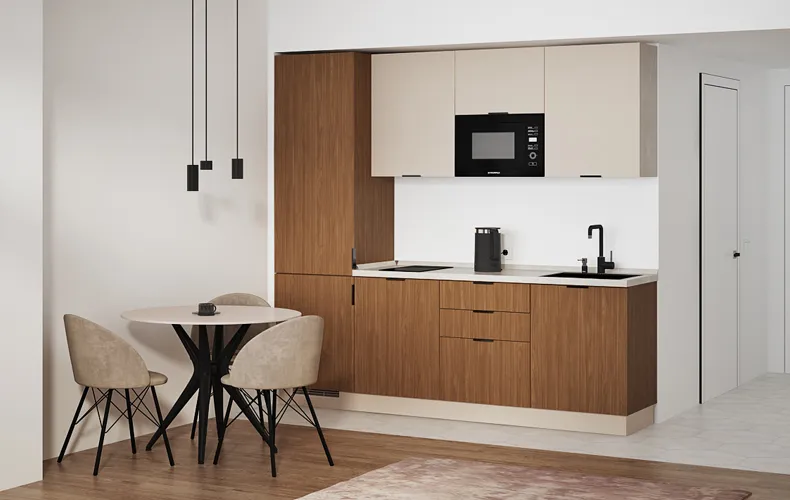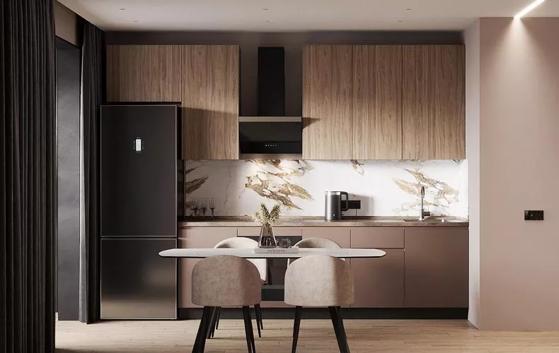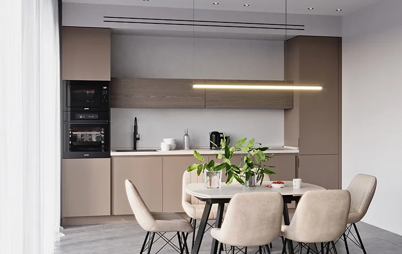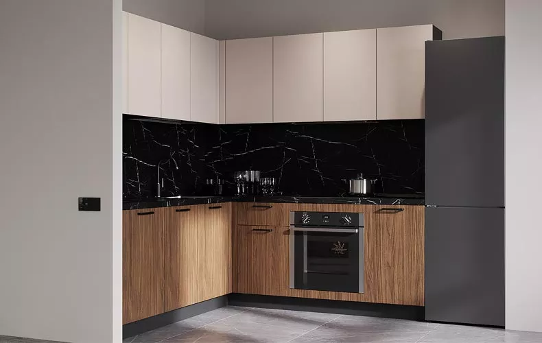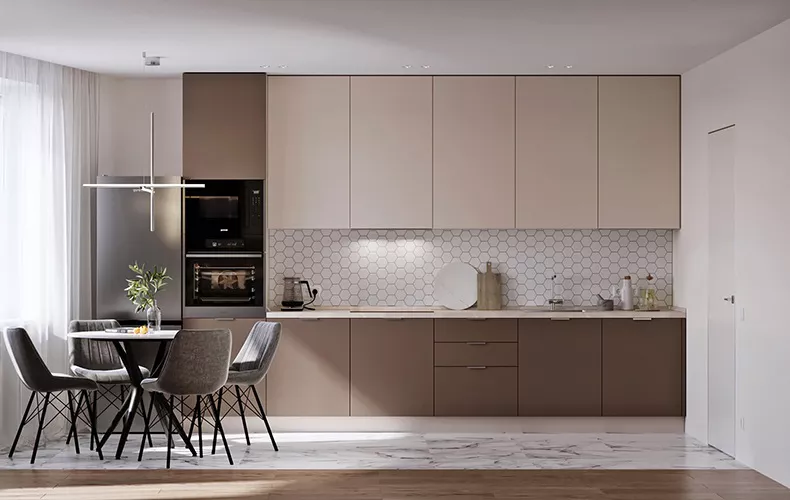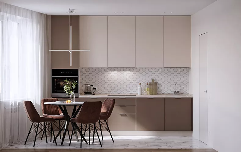 Фабио Комфорт сет 12 представлен в монохроматическом сочетании двух оттенков коричневого: внизу — цвета молочного шоколада, сверху — нежный кремовый. Сочетание двух близких оттенков с плавным перетеканием тонов в зоне кухонного фартука и столешницы вносят в атмосферу покоя нотки легкой энергичности.