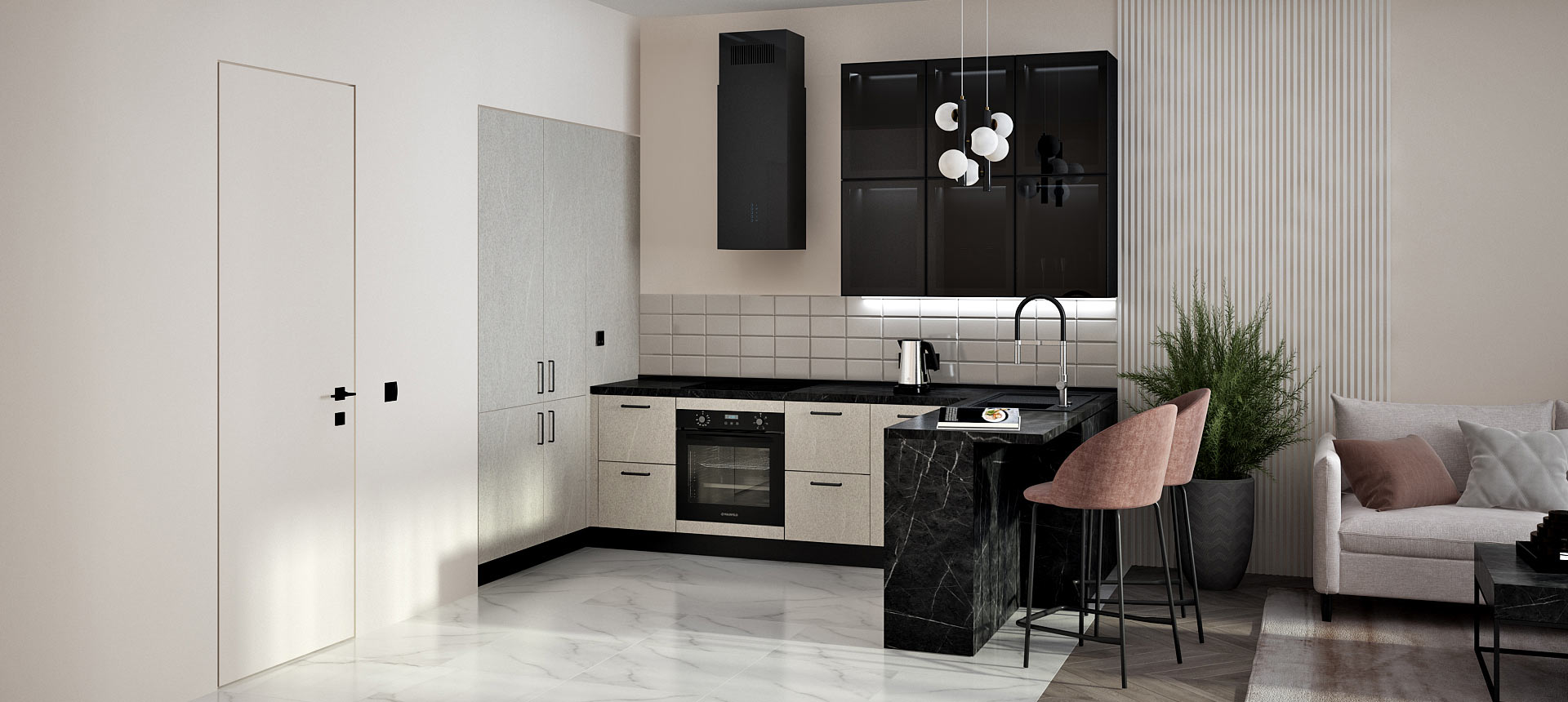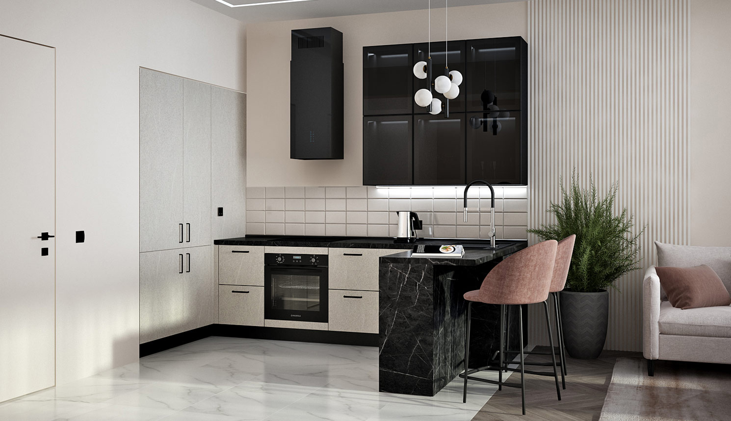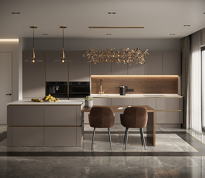 • Красивая кухня с золотыми акцентами в двухкомнатной квартире бизнес-класса