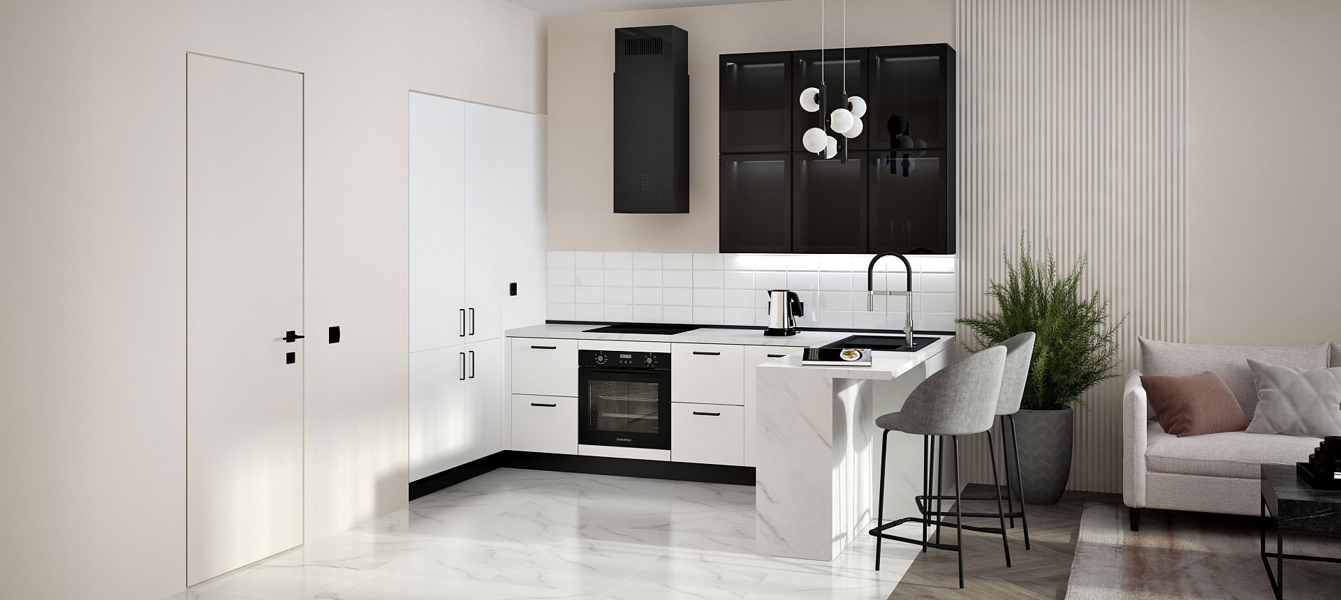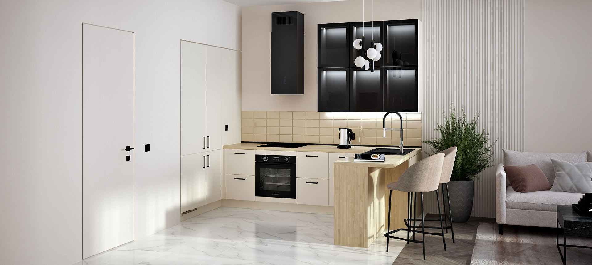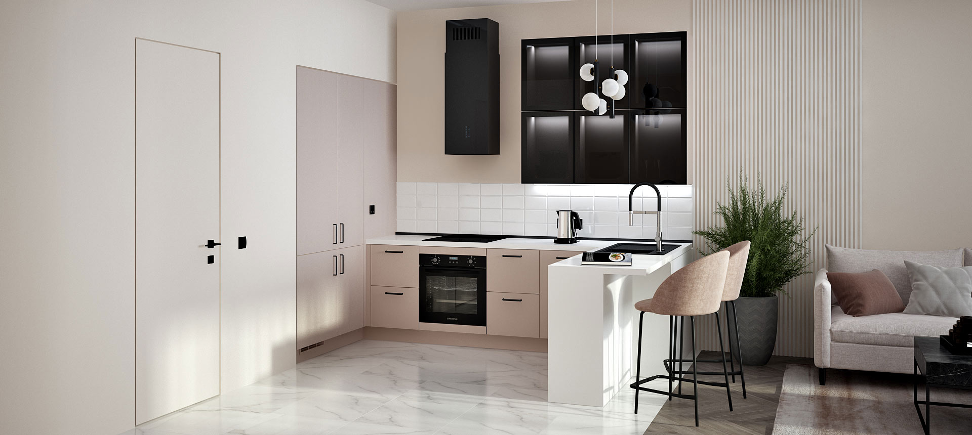 • Красивая кухня с золотыми акцентами в двухкомнатной квартире бизнес-класса