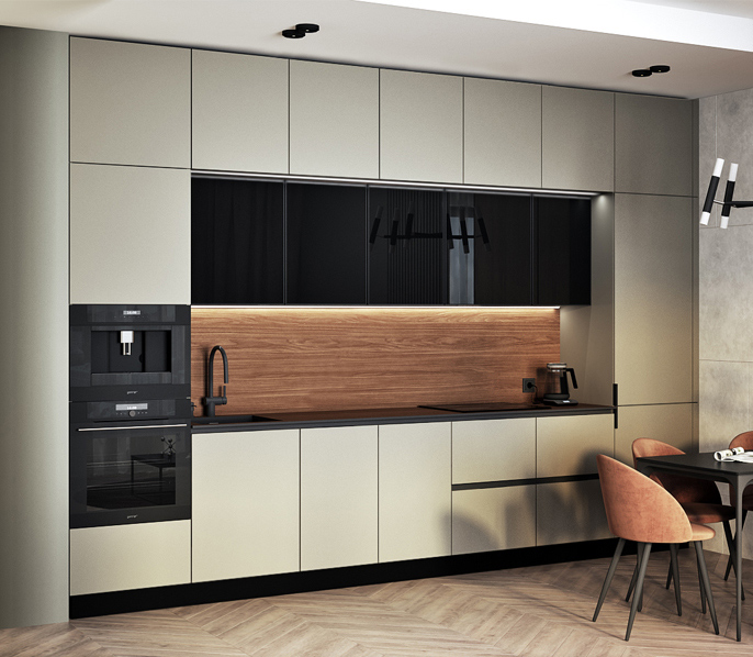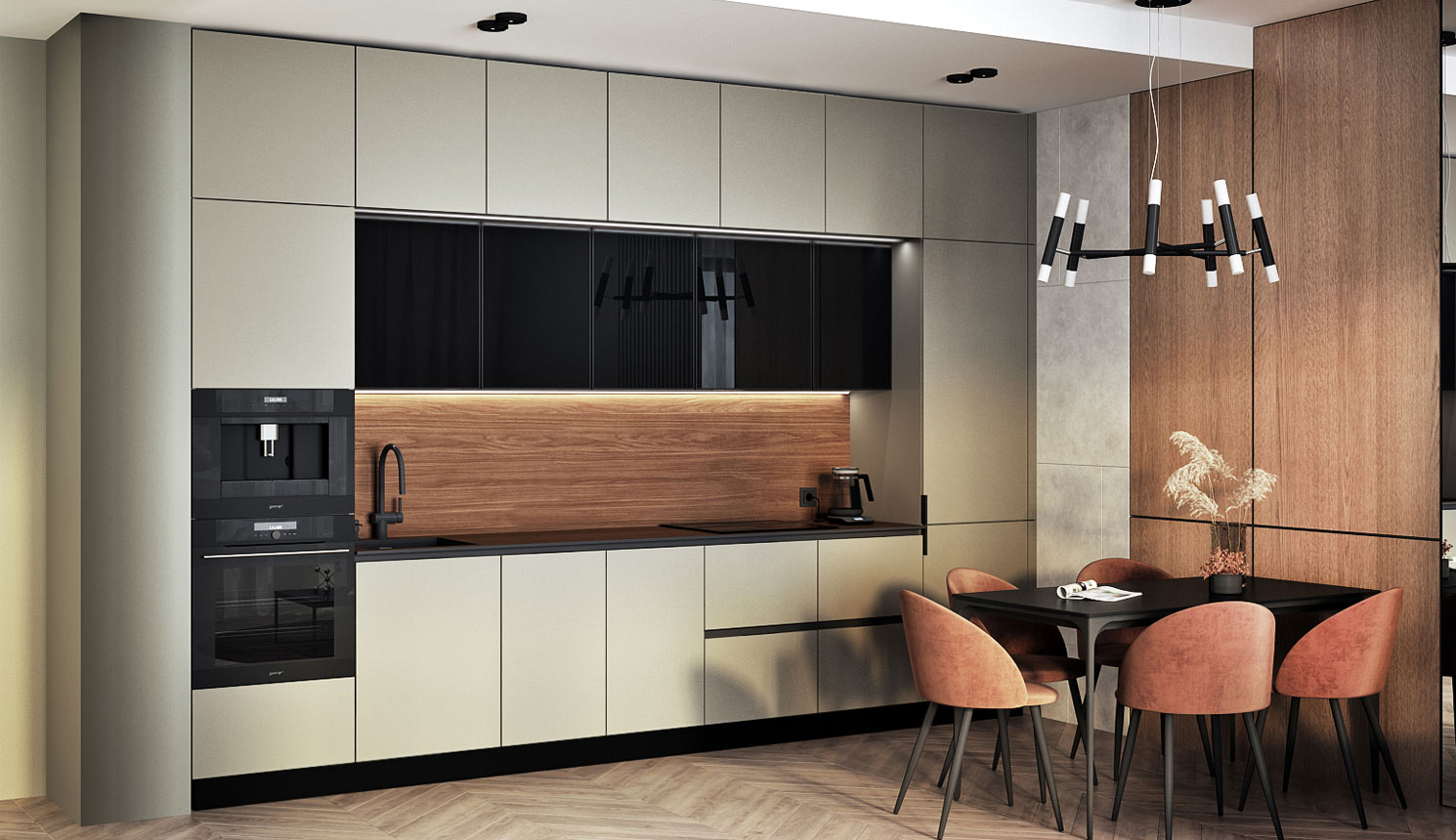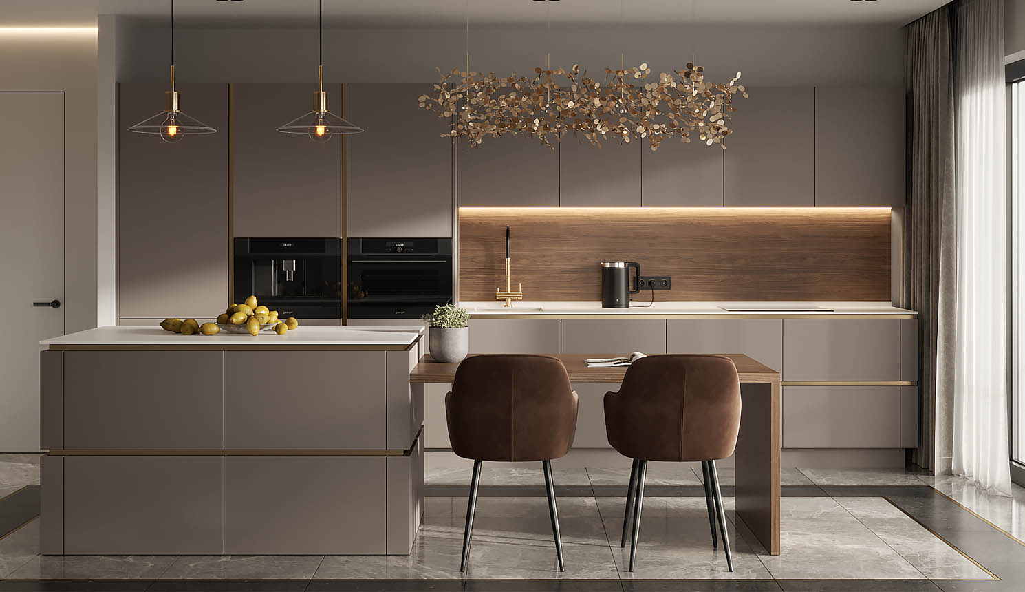 Красивая кухня с золотыми акцентами в двухкомнатной квартире бизнес-класса