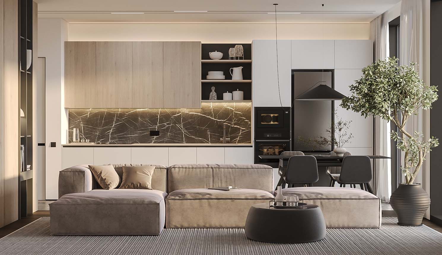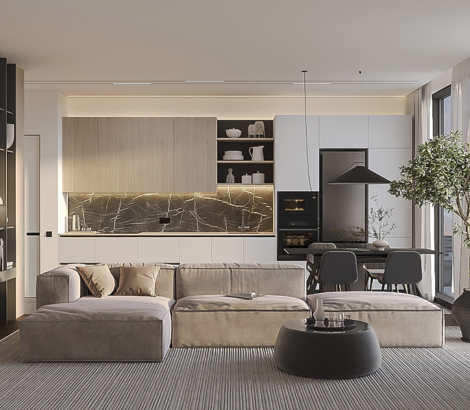 Светлая функциональная квартира в бежевых тонах для семьи из трех человек