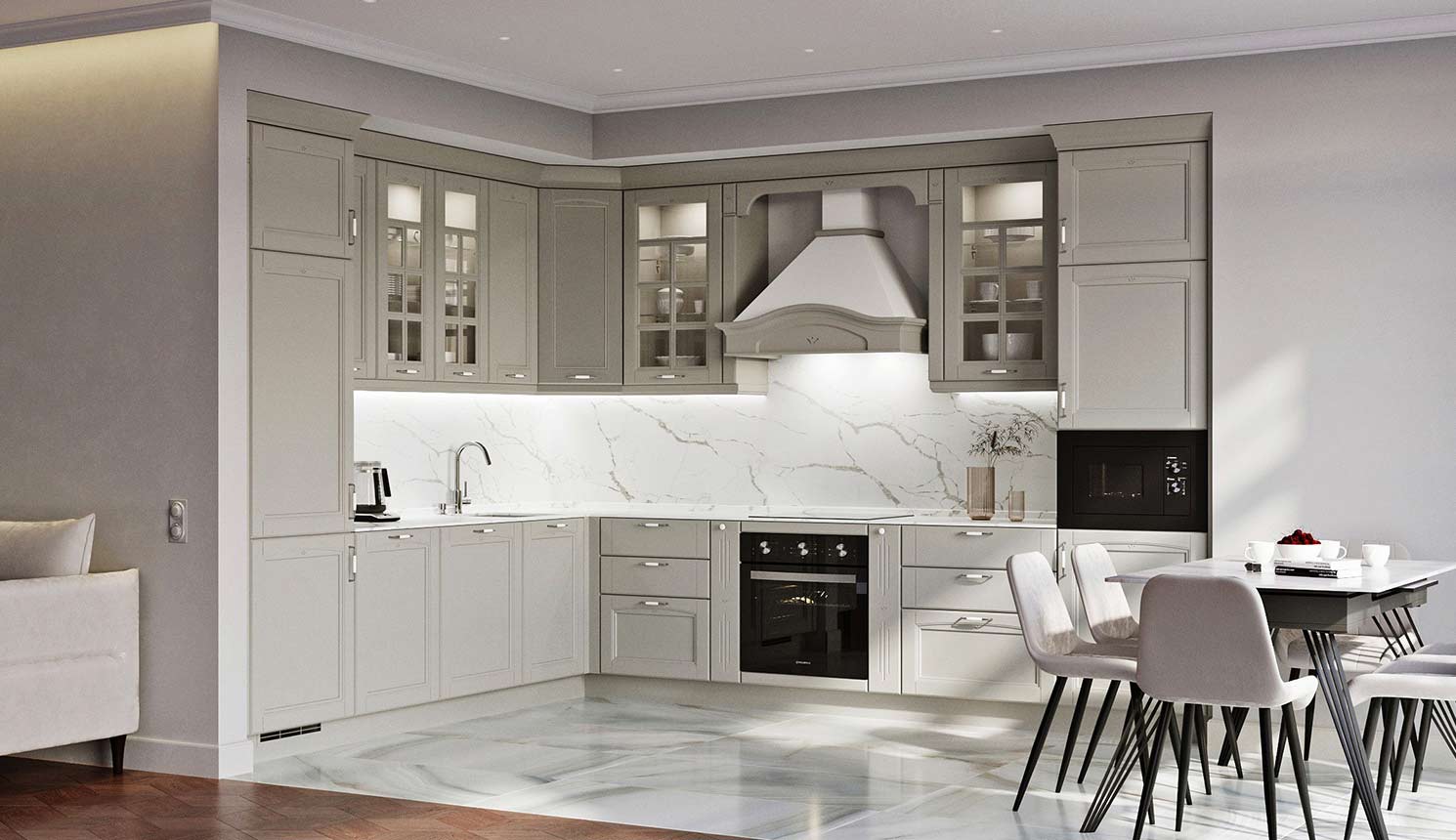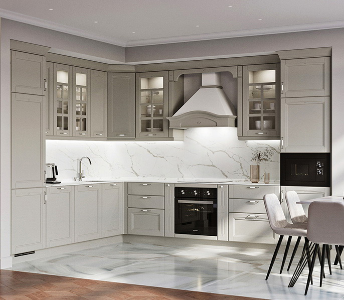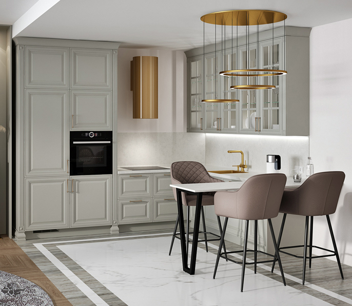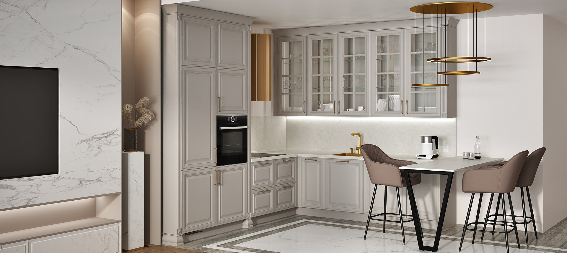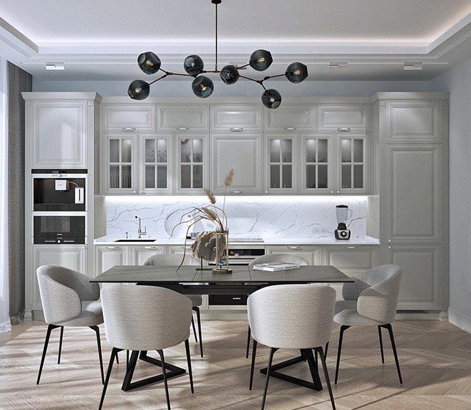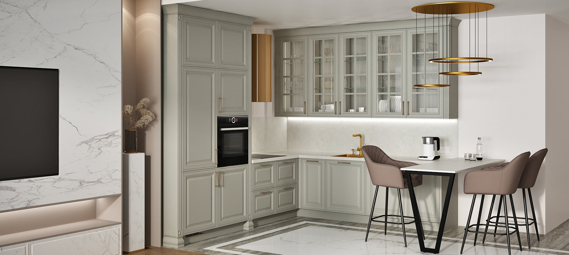 Современная классика — облегченный вариант классической кухни. Кухню в неоклассическом стиле отличает лаконичность, отсутствие выраженной патины, меньшее количество резного декора. Для нее характерны рамочные или имитирующие рамочные фасады, светлые тона и сочетание классических элементов мебели с самой современной бытовой техникой.