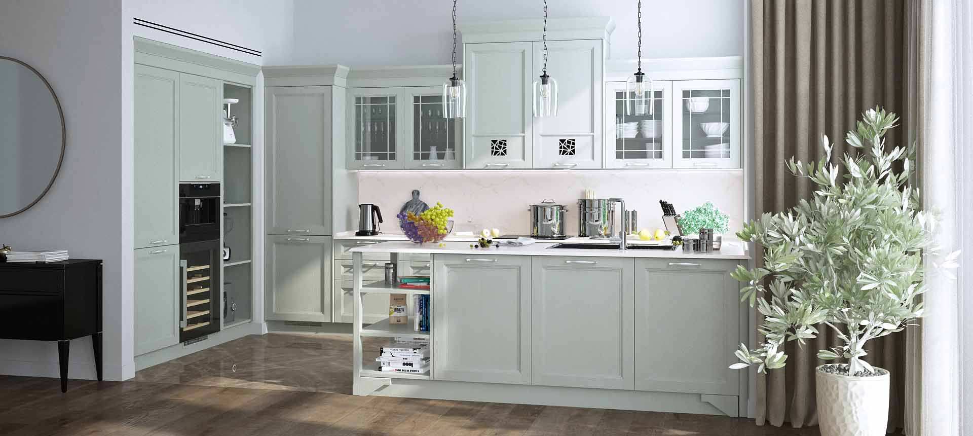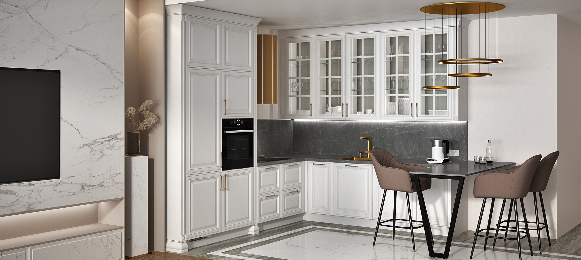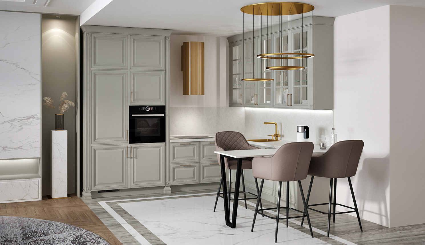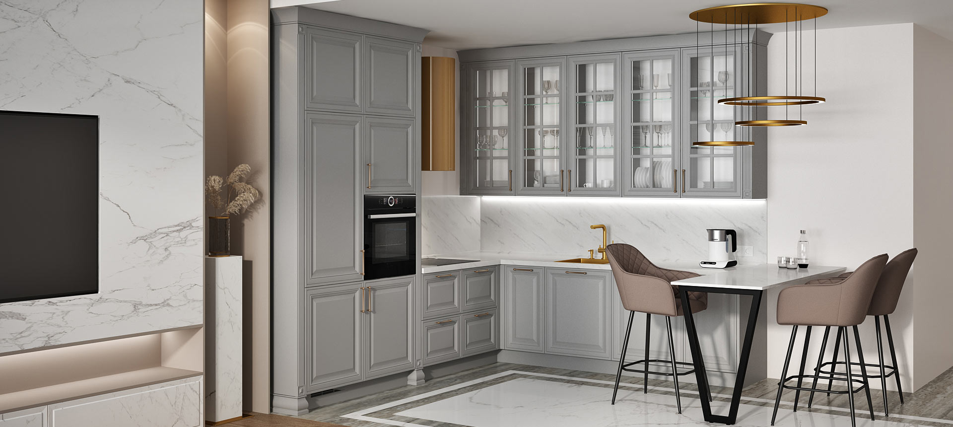 Современная классика — облегченный вариант классической кухни. Кухню в неоклассическом стиле отличает лаконичность, отсутствие выраженной патины, меньшее количество резного декора. Для нее характерны рамочные или имитирующие рамочные фасады, светлые тона и сочетание классических элементов мебели с самой современной бытовой техникой.