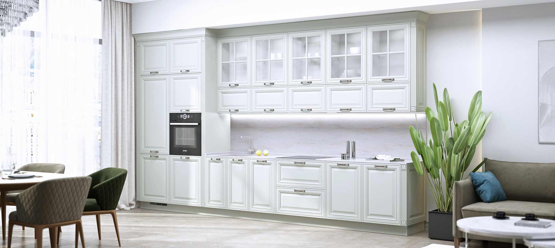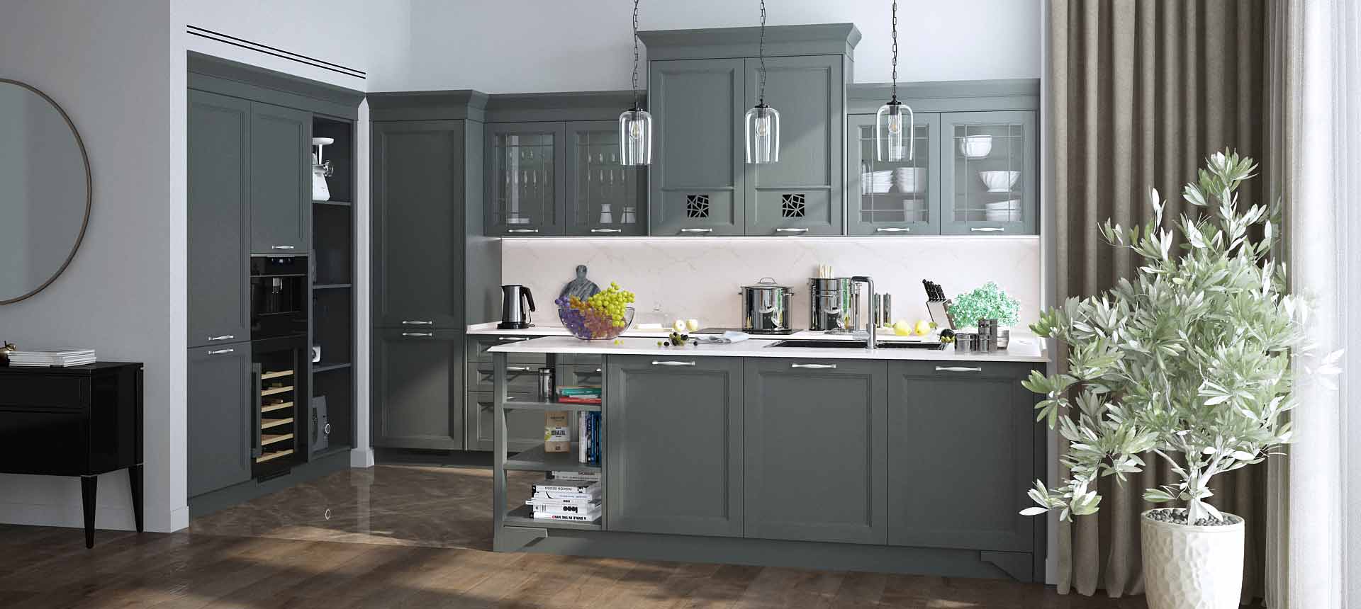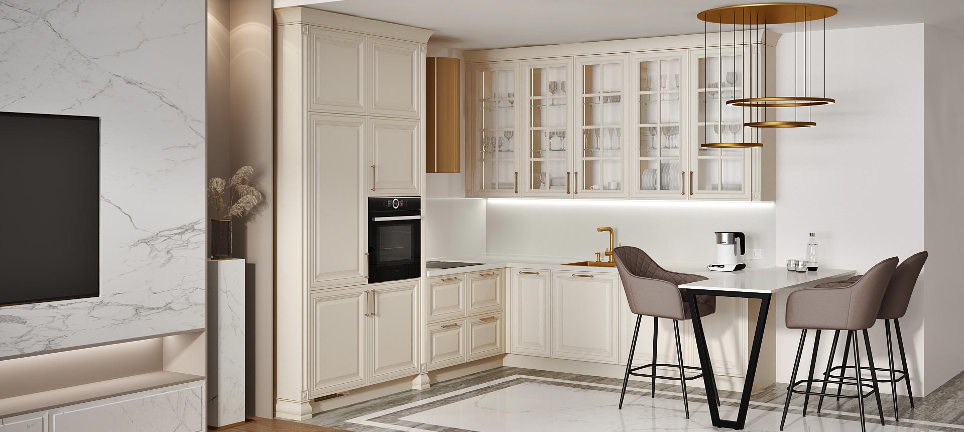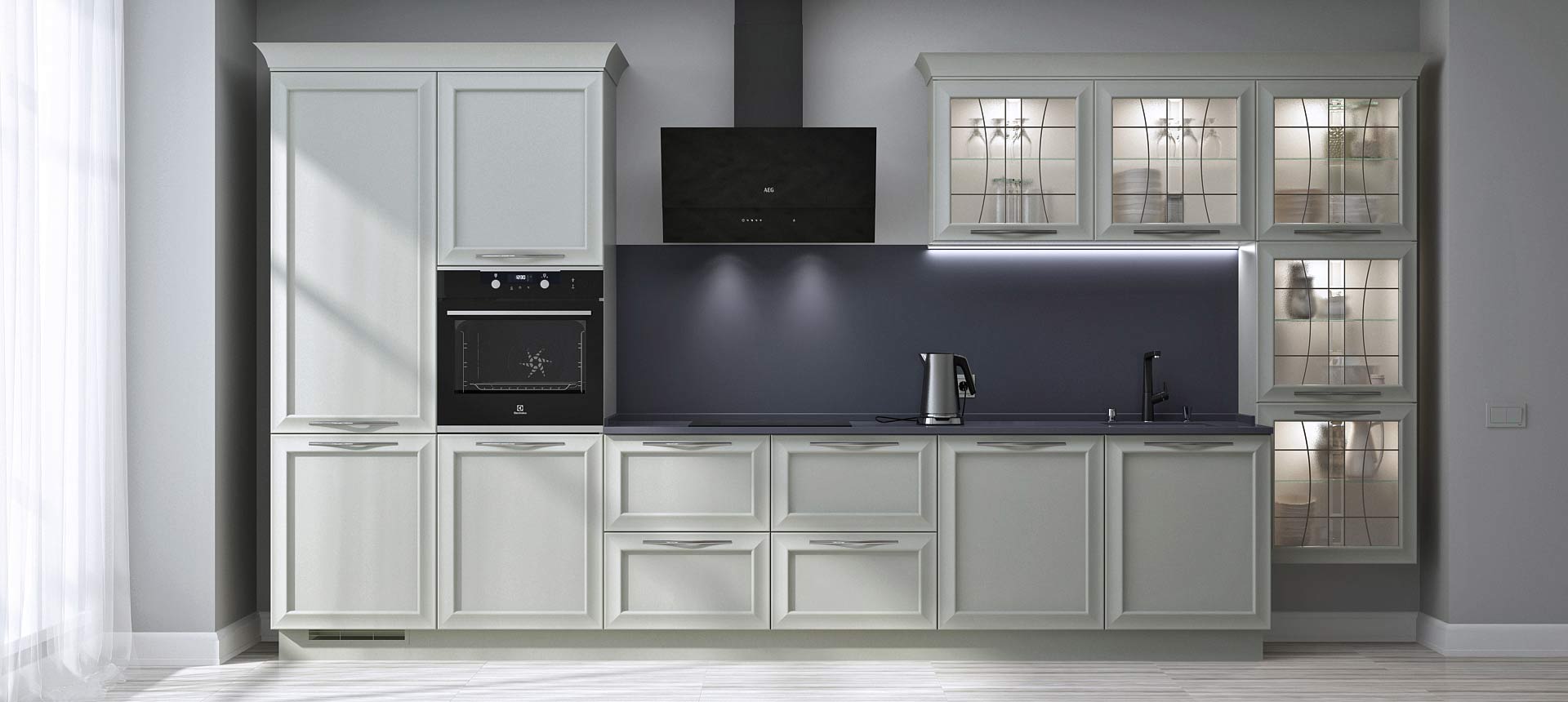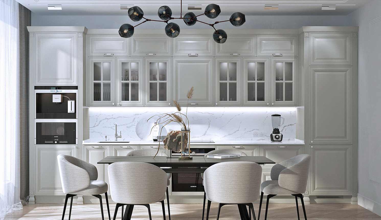 Современная классика — облегченный вариант классической кухни. Кухню в неоклассическом стиле отличает лаконичность, отсутствие выраженной патины, меньшее количество резного декора. Для нее характерны рамочные или имитирующие рамочные фасады, светлые тона и сочетание классических элементов мебели с самой современной бытовой техникой.