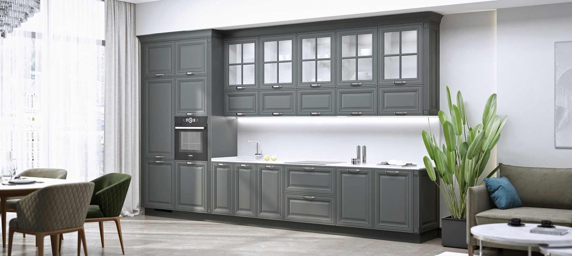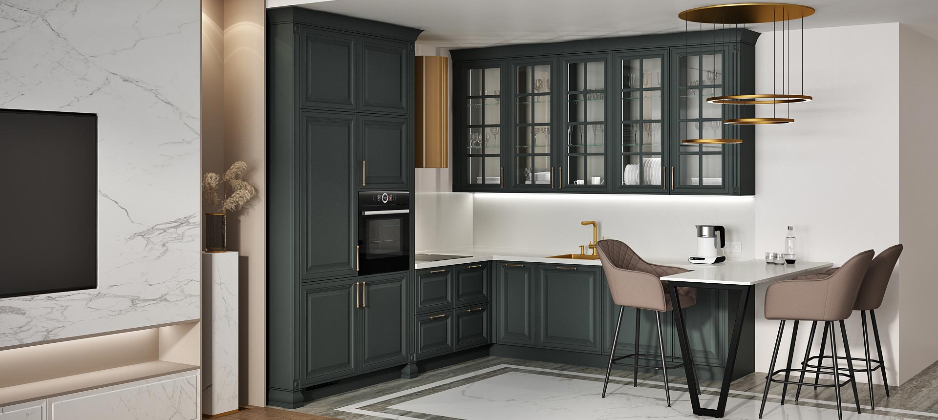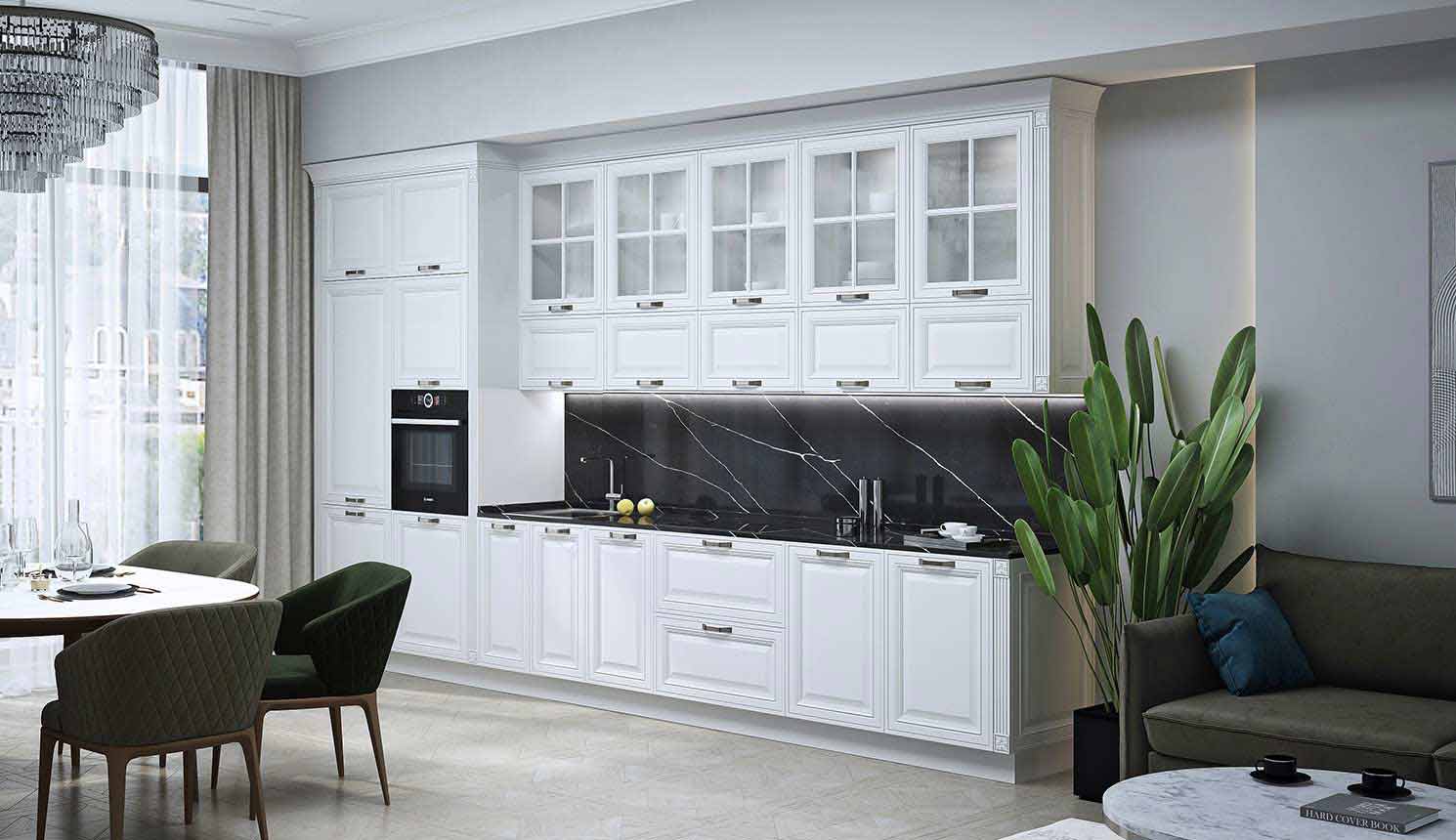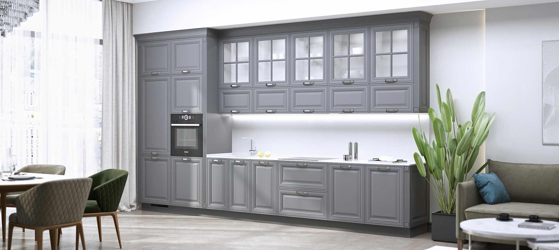 Современная классика — облегченный вариант классической кухни. Кухню в неоклассическом стиле отличает лаконичность, отсутствие выраженной патины, меньшее количество резного декора. Для нее характерны рамочные или имитирующие рамочные фасады, светлые тона и сочетание классических элементов мебели с самой современной бытовой техникой.
