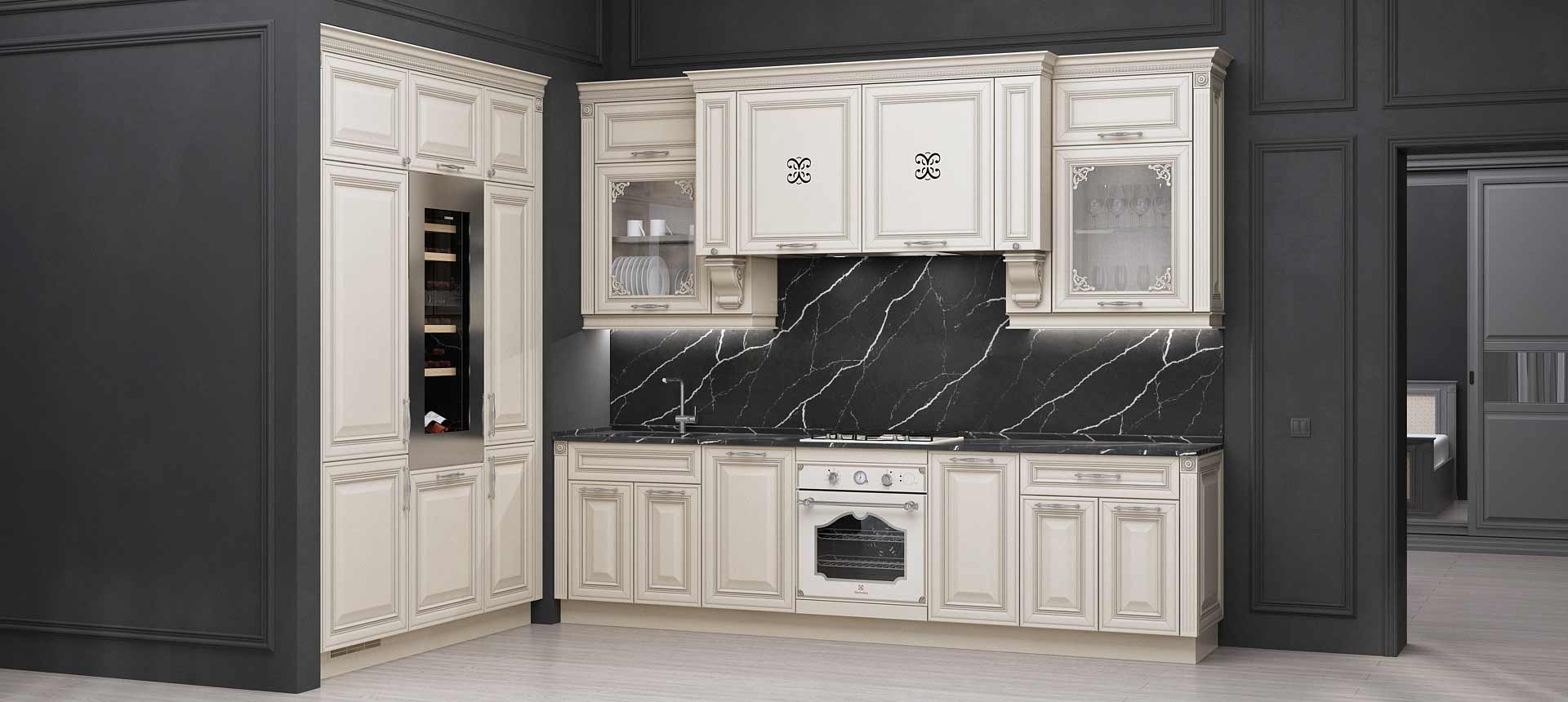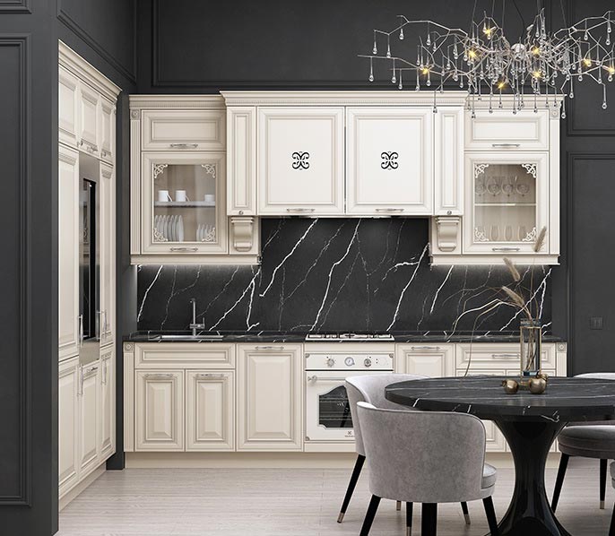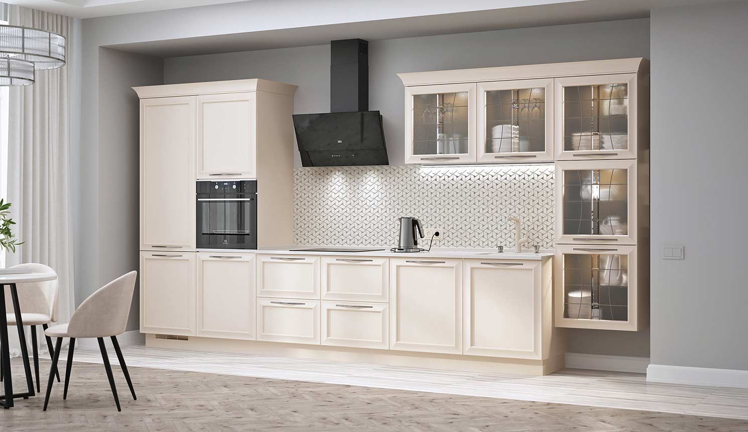 Классический интерьер кухни отличает мягкая палитра оттенков белого, бежевого, а также благородных коричневого, темно-синего или черного цветов. Сочетание цветов для классического гарнитура нехарактерно. Стиль отличают фасады с фрезеровкой и обилие фигурных украшений — карнизов, колонн, порталов и других элементов сложной формы. Часто такой интерьер дополняют винтажные детали и элементы декора, бытовая техника и вытяжка в стиле ретро. Классическая кухня — сочетание симметрии и простора. Стеклянные детали часто оформляются витражами, подчеркивающими роскошь интерьера. Подробнее о кухнях в классическом стиле вы можете прочитать в статье.