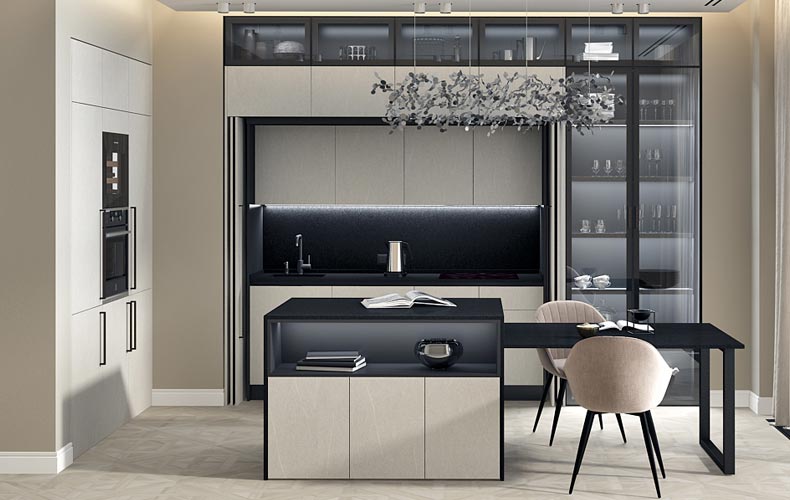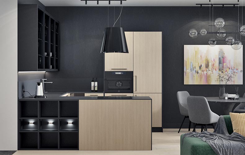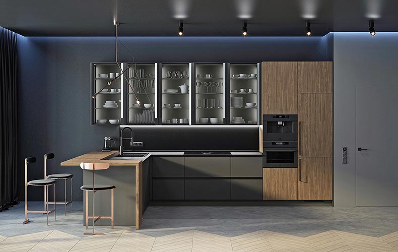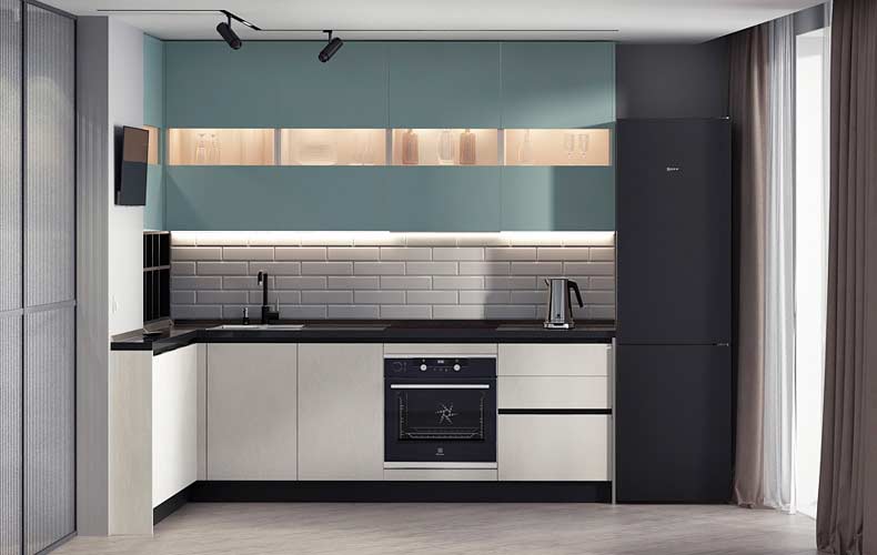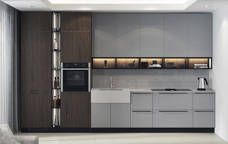 Кухонный гарнитур Фабио 16 представлен угловой конфигурацией со встроенными шкафами и колонками. По бокам в колонках установлена бытовая техника, в центре расположены шкафы и открытые полки с подсветкой.