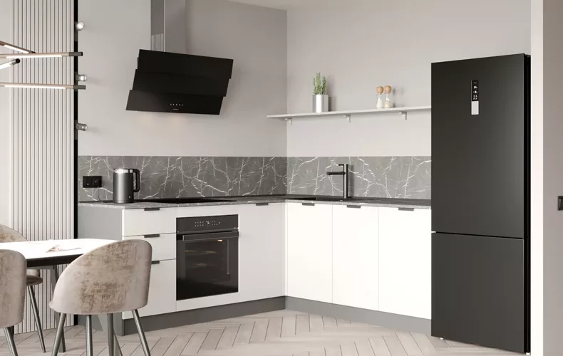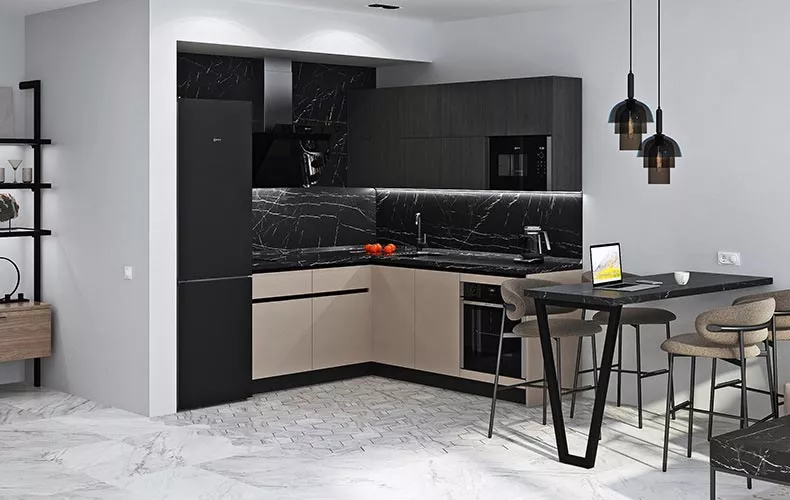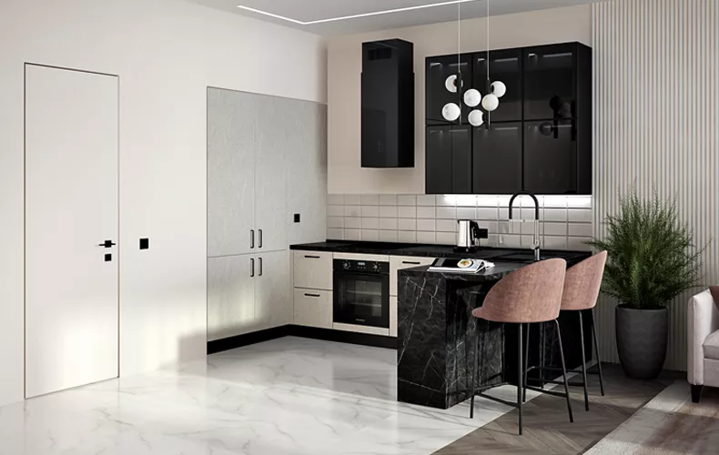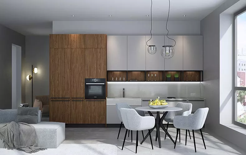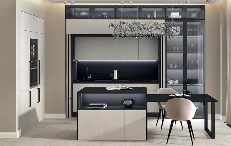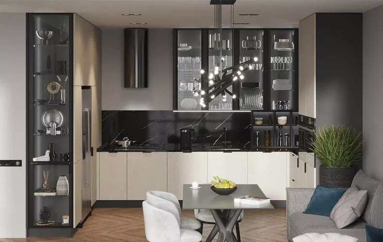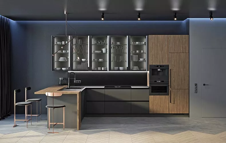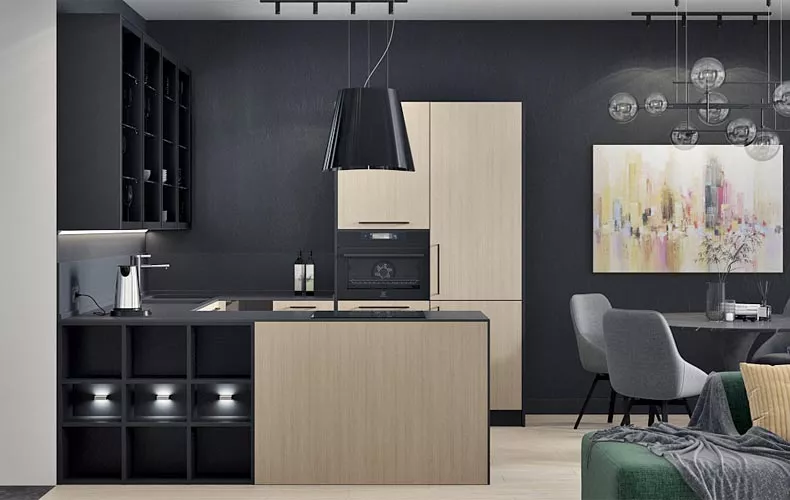 Кухонный гарнитур Фабио с ламинированными фасадами Egger станет оптимальным решением для тех, кто предпочитает оригинальность в оформлении интерьера. Конструктивные элементы мебели изготовлены из прочного и устойчивого к повреждениям композитного материала Egger. Для внешней отделки используется контрастное сочетание белого, чёрного, древесного оттенков. Угловая конфигурация позволяет разместить гарнитур по двум линиям, разделив пространство на несколько зон: обеденную, для готовки и хранения. В проекте предусмотрены полки с витражами, открытые ниши, встроенная техника, локальная подсветка.