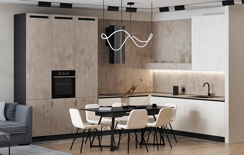 Продукция фабрики выполняется в классических и современных стилях. Вы можете реализовать все свои идеи благодаря разнообразию фасадов и фурнитуры. Классические и современные кухни могут быть дополнены бытовой техникой.