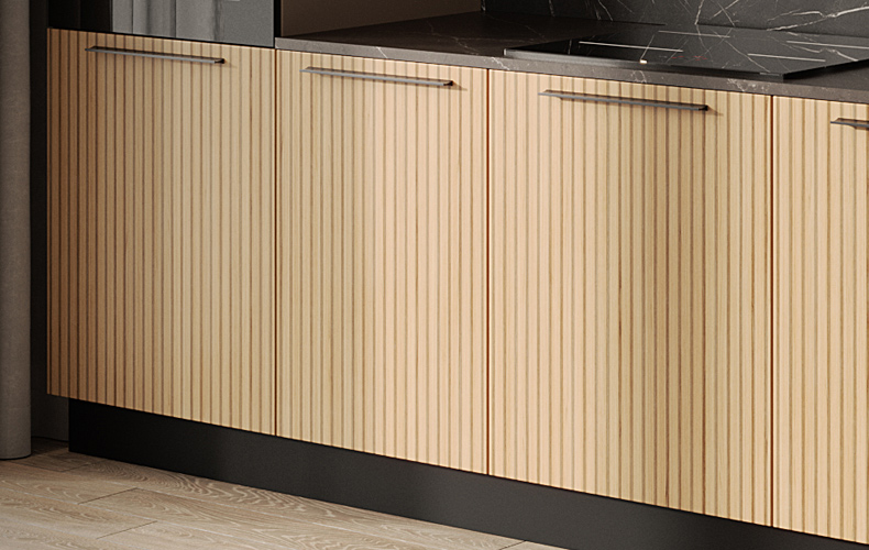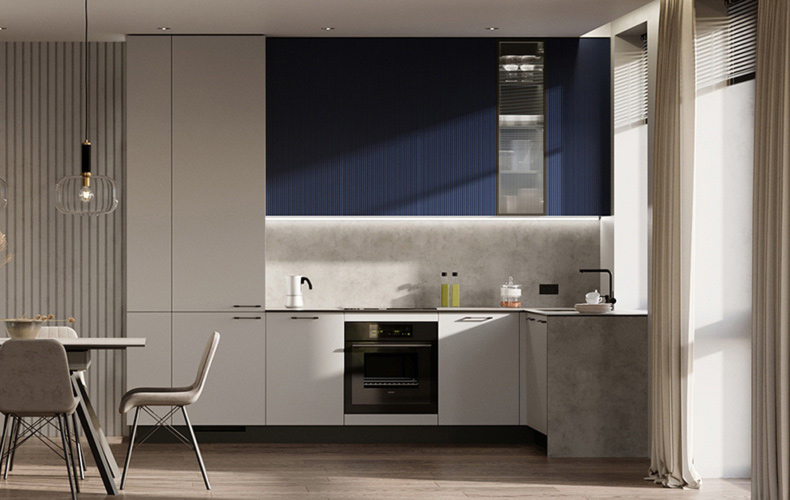 Кухонный гарнитур Линеа 2 - современный гарнитур прямой конфигурации, размещенный в кухне-гостиной с окном. Слева установлены колонки под встраиваемый холодильник и хранение. Также установлена витражная секция с полками. Над рабочей зоной размещаются навесные шкафы с фасадами Линеа. В нижних шкафах установлены ящики разной высоты и шкаф под мойку.