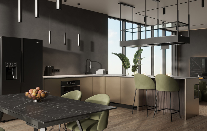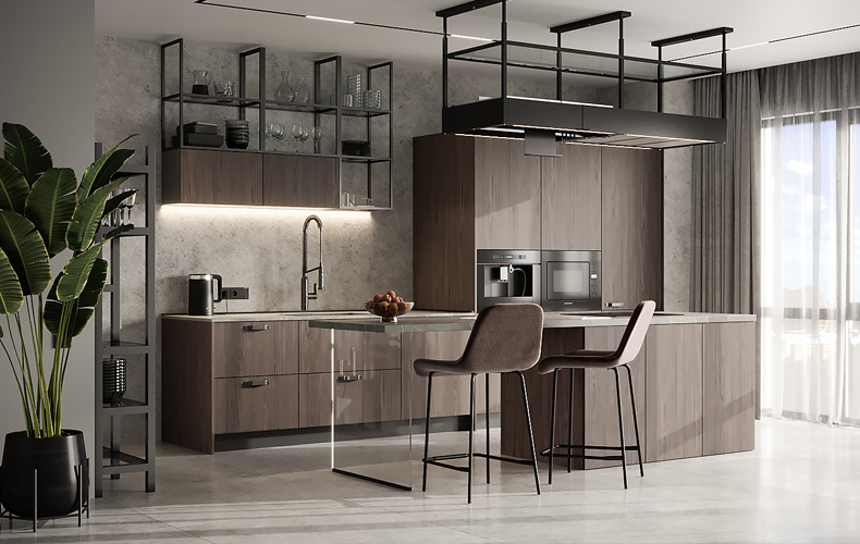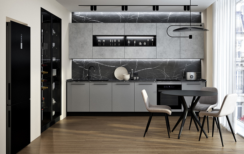 Кухонный гарнитур Лофт 4 – оригинальный способ украсить интерьер в современной стилистике. Хай-тек, минимализм, модерн, индустриальный стиль предполагают акцент на практичность, и каждый элемент этого гарнитура находится на своём месте и продуман до мелочей. На многофункциональном острове размещена варочная панель, мойка. Для хранения принадлежностей предусмотрены ящики различной высоты, открытые полки, выдвижные системы. В нише расположены колонки под бытовую технику. В оформлении используется контрастное сочетание оттенков.