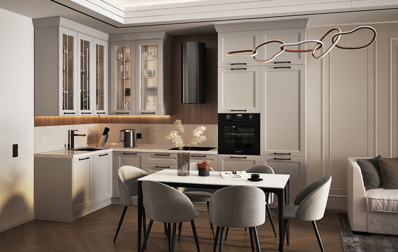 Кухню-гостиную дополняет обеденная группа с овальным столом и стульями, выполненными также в ткани бежевого оттенка.Представленные варианты цветовых сочетаний носят ознакомительный характер как пример дизайнерского решения и могут отличаться по характеристикам, материалам, ценам от модели или комплекта.