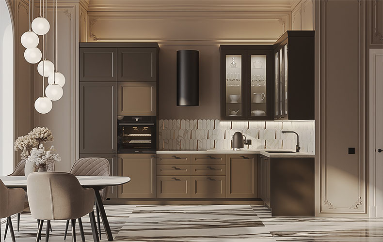Кухонный гарнитур Массимо 5 неоклассического стиля выполнен в бежевых оттенках со столешницей под камень. Кухня имеет прямую конфигурацию с рабочей зоной по центру, колонкой под встроенный холодильник и высокими навесными шкафами и полками. Стеновая панель закрывает занимает всё открытое пространство стены за полками. В правой части гарнитура есть витражный шкаф с подсветкой.