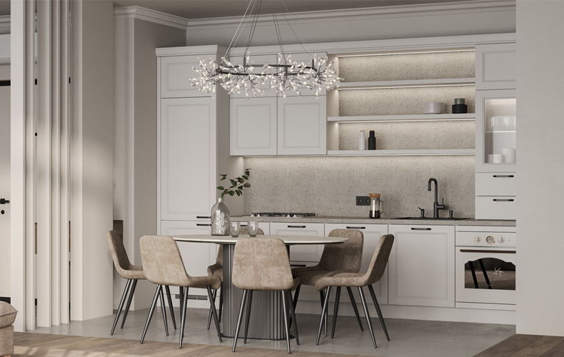 Кухонный гарнитур Массимо 7 представлен в угловой конфигурации с витражами и колонками. Под встраиваемую технику предусмотрены высокие колонки. В нижних шкафах установлены ящики и шкафы для удобного хранения и пользования. Над варочной панелью в центральной части установлена цилиндрическая вытяжка, а правее располагается секция витражных шкафов с локальной подсветкой.