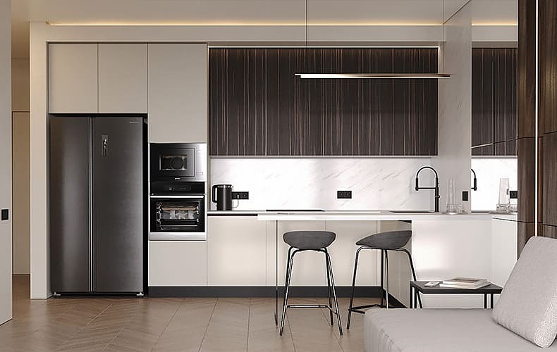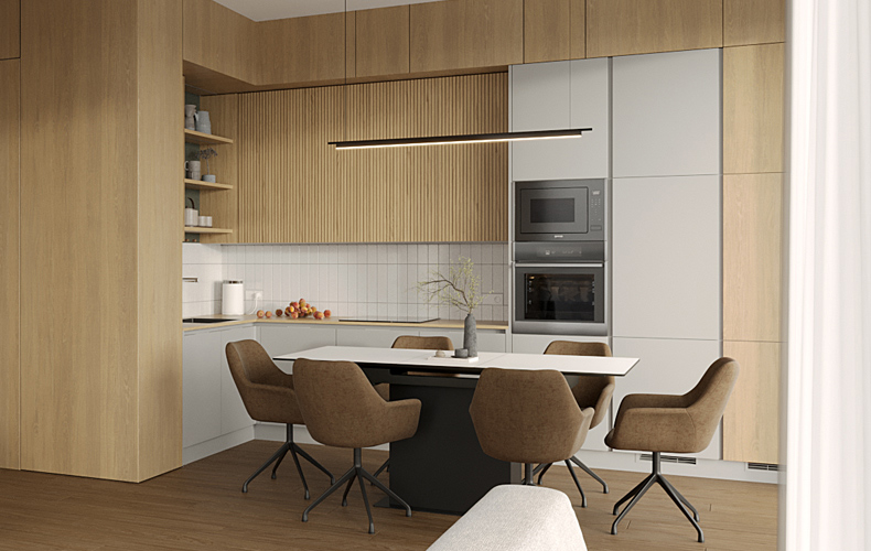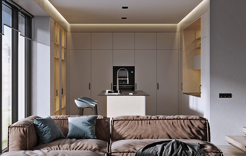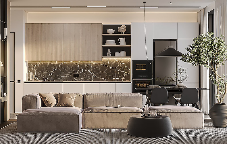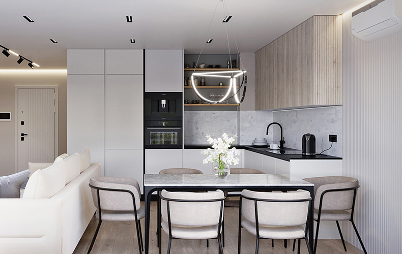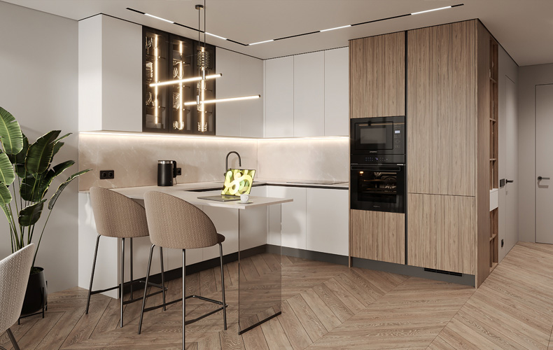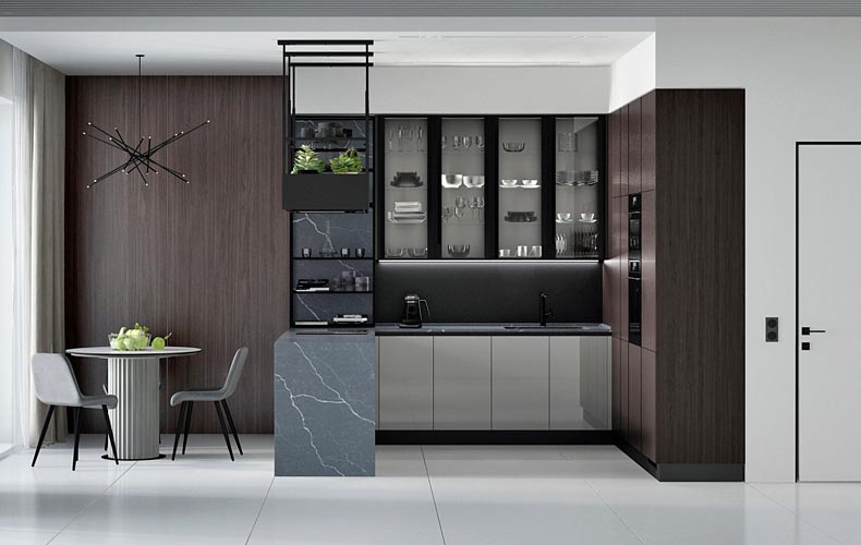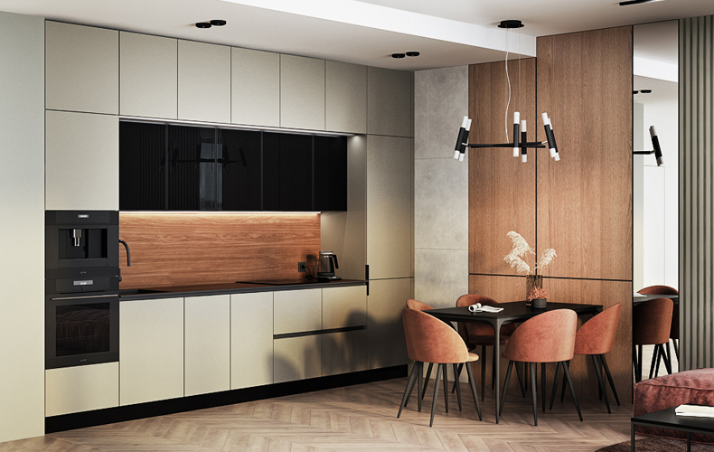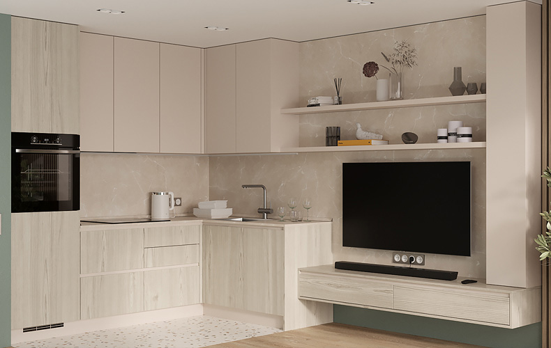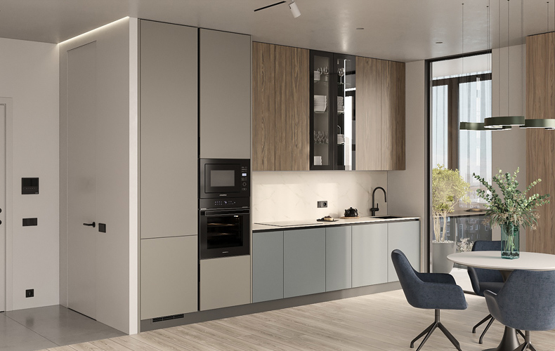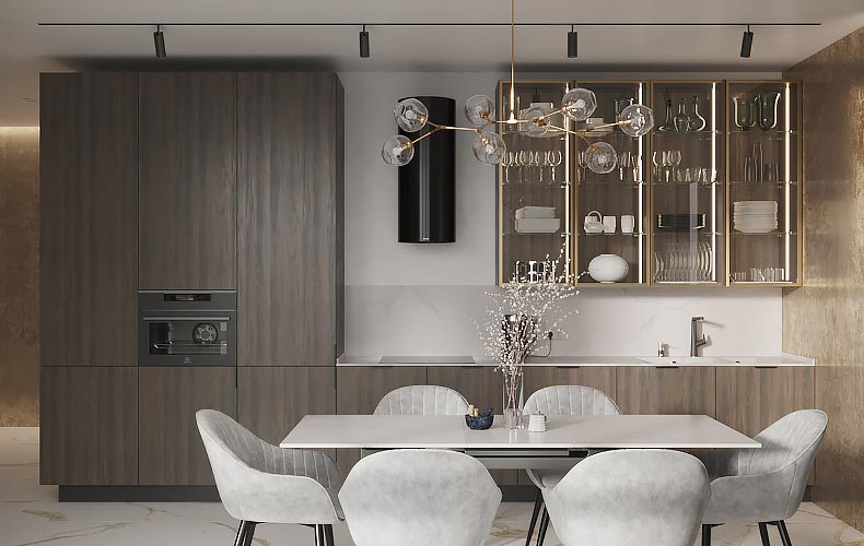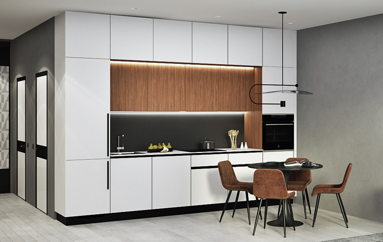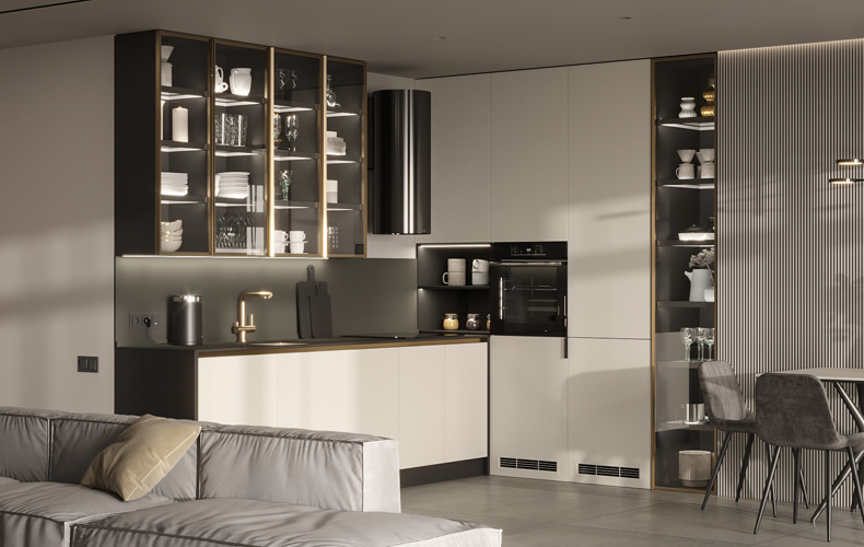Кухонный гарнитур Маттео 17 представляет комплект мебели для кухни-гостиной. Кухня имеет прямую конфигурацию с высокими навесными шкафами со стеклом. Есть колонка под встраиваемый холодильник. В рабочей зоне размещаются варка с духовым шкафом, вытяжка, а также мойка со смесителем. В правой части расположена мебель для гостиной в том же исполнении.