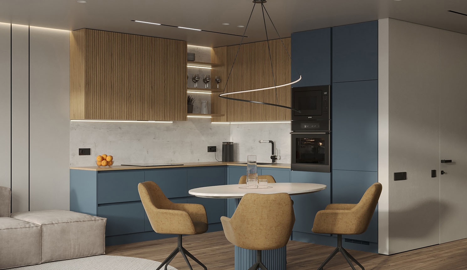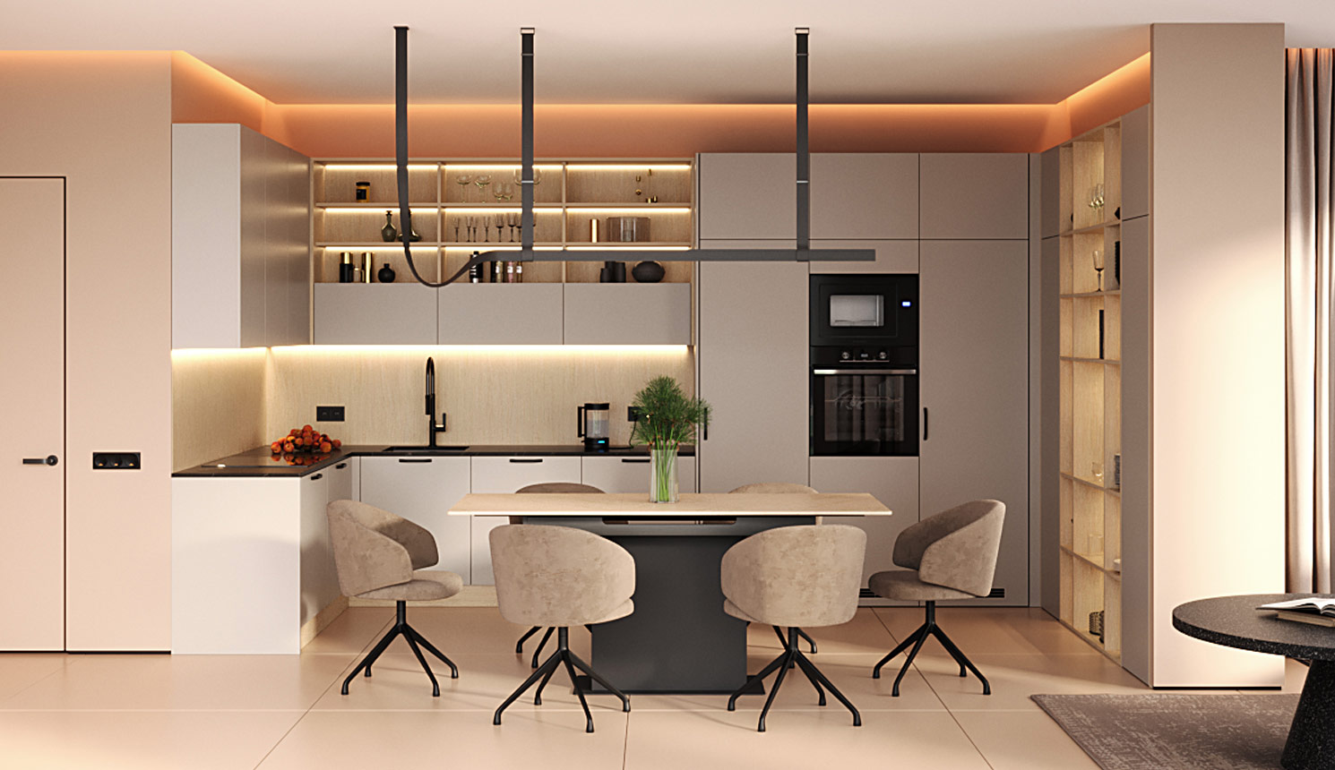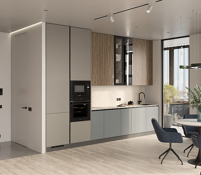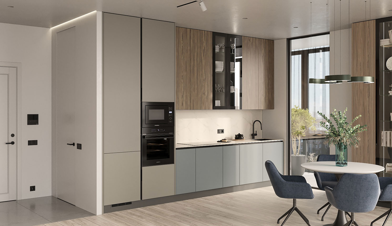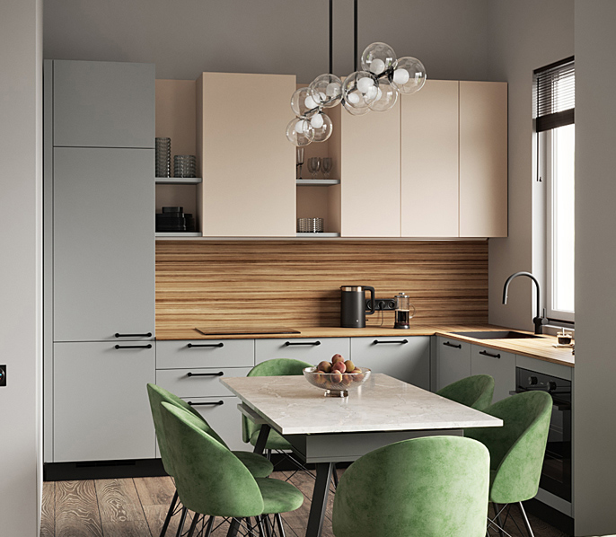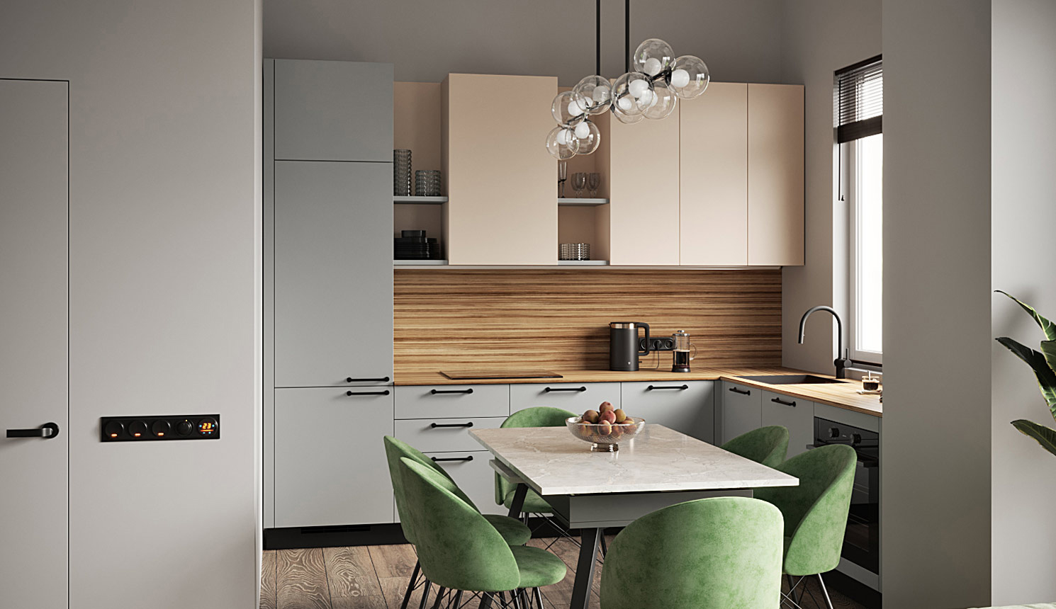В этом году в тренде современный и скандинавский стили, неоклассика и минимализм. В моде серые, белые, бежевые, пастельные кухни с ненавязчивыми акцентами. Актуальны имитация фактур под дерево, бетон, камень, керамику, матовые поверхности, фасады без ручек и декора, кухни-трансформеры. Подробнее о трендах дизайна 2023 года можно прочитать в статье.