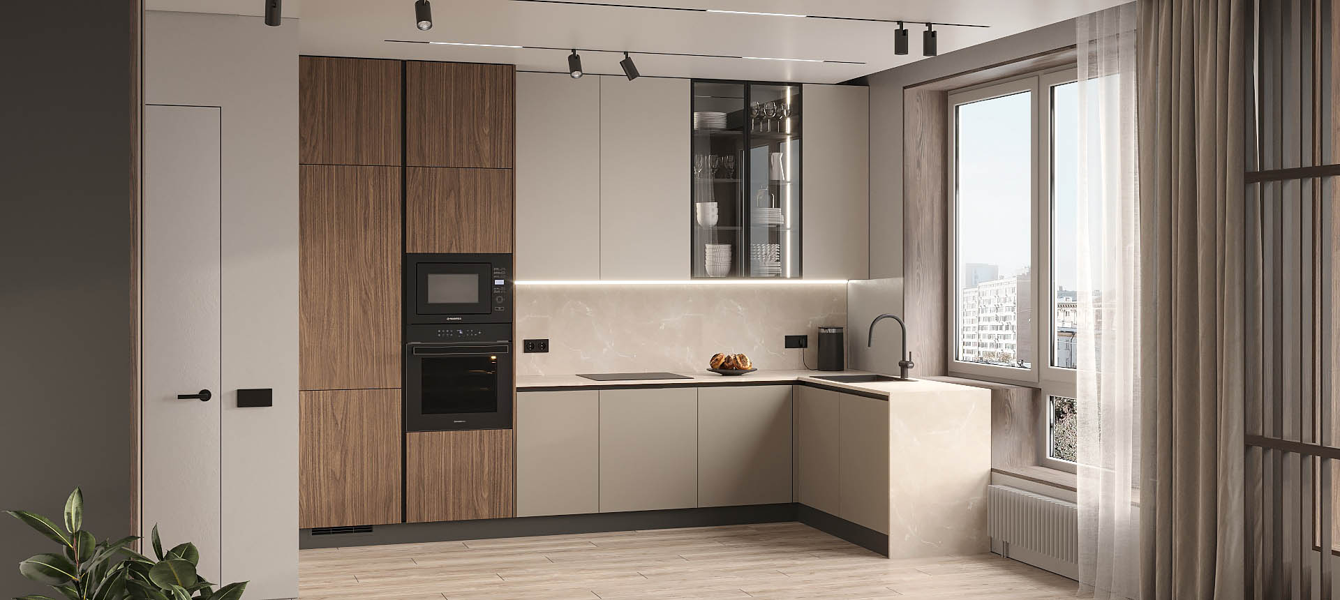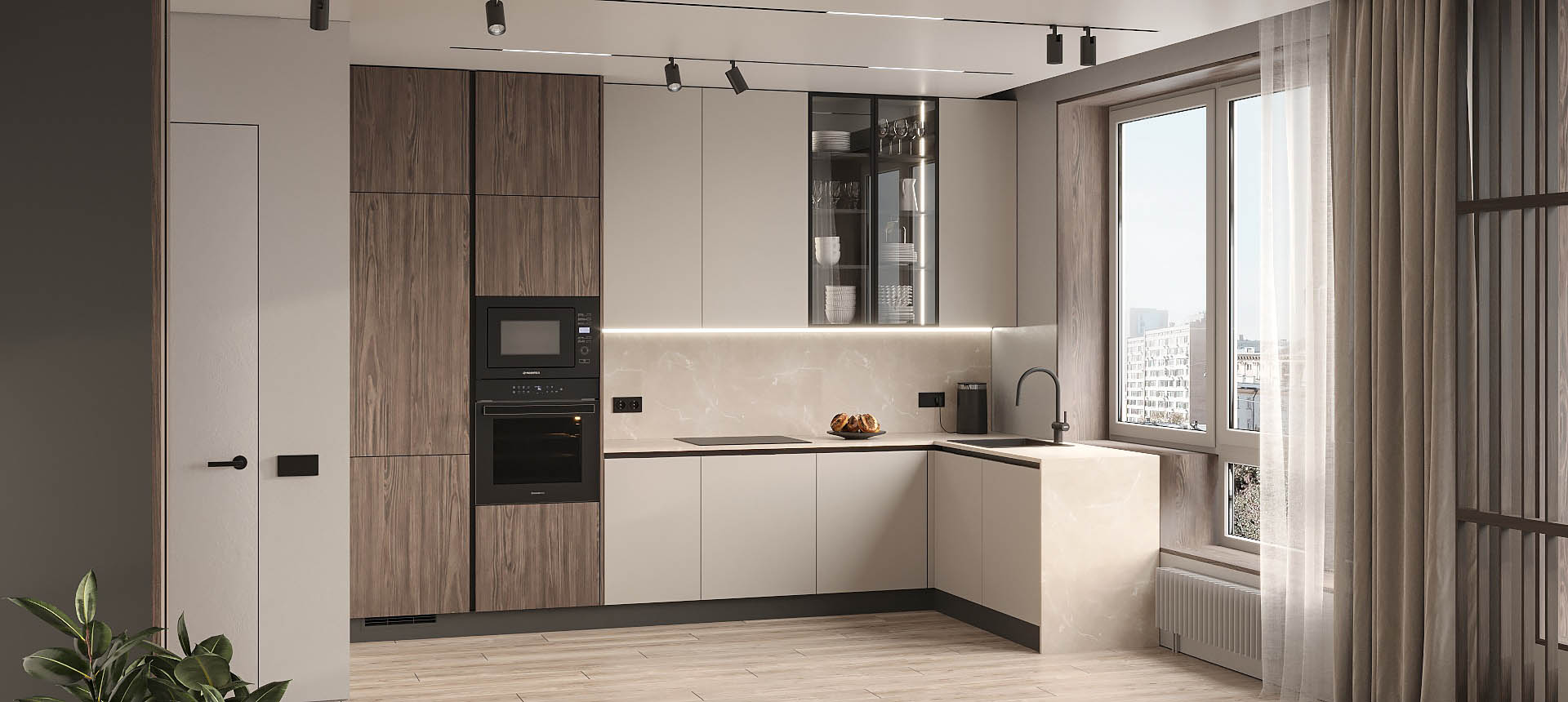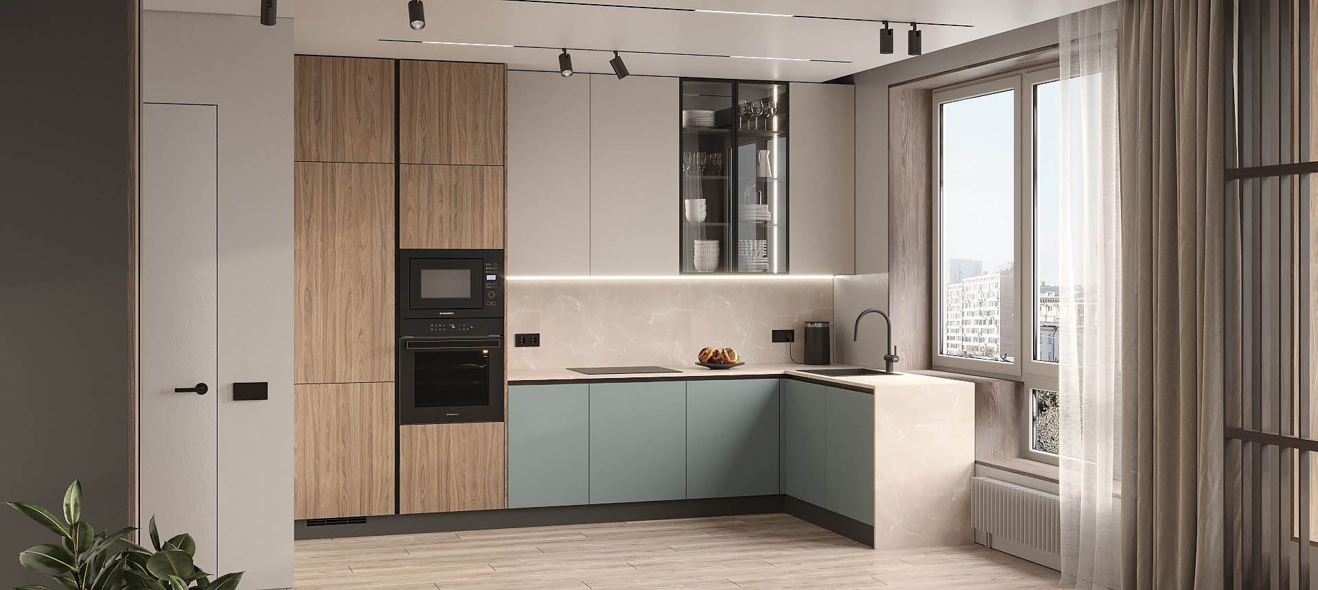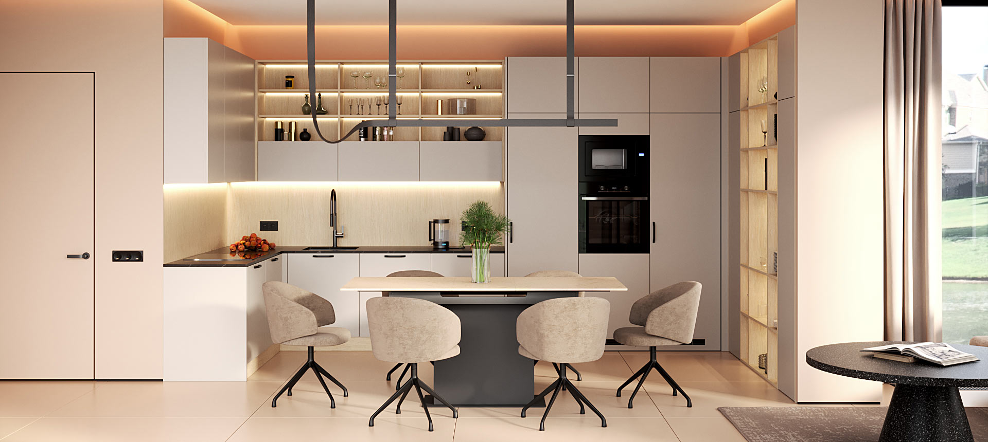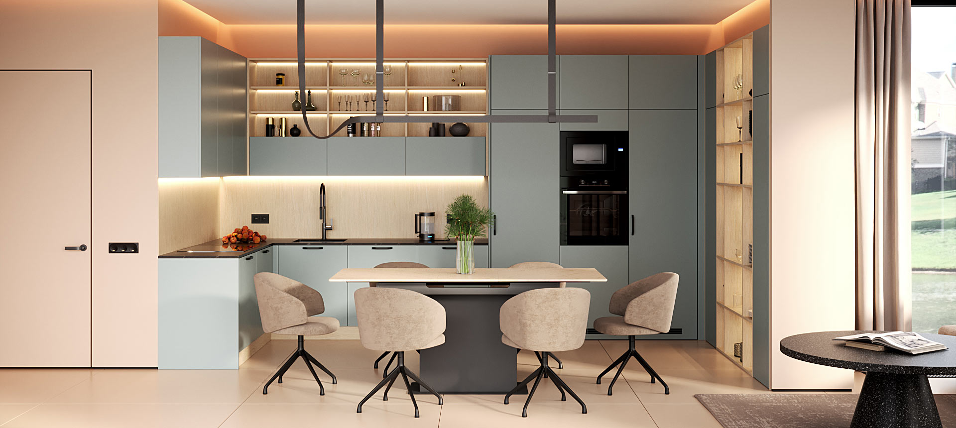 В этом году в тренде современный и скандинавский стили, неоклассика и минимализм. В моде серые, белые, бежевые, пастельные кухни с ненавязчивыми акцентами. Актуальны имитация фактур под дерево, бетон, камень, керамику, матовые поверхности, фасады без ручек и декора, кухни-трансформеры. Подробнее о трендах дизайна 2023 года можно прочитать в статье.
