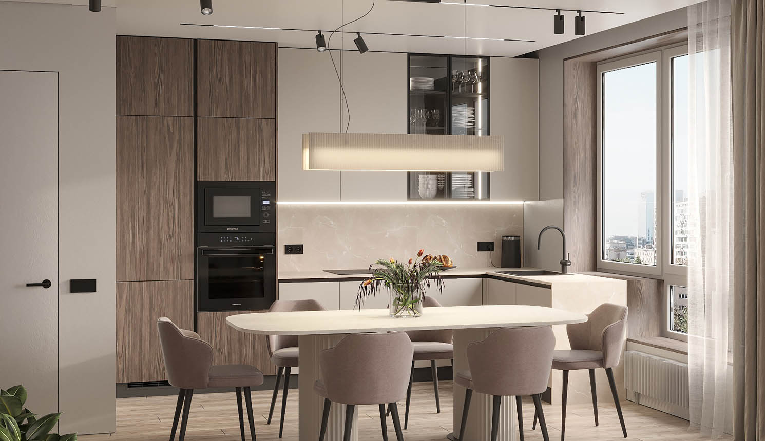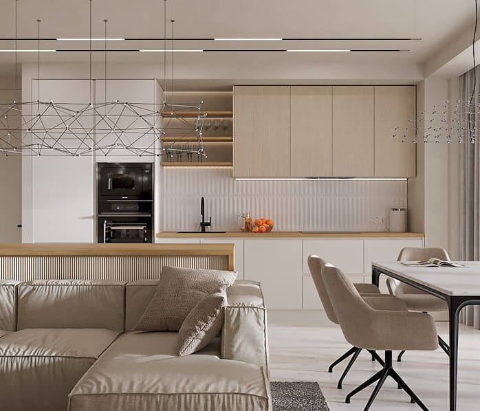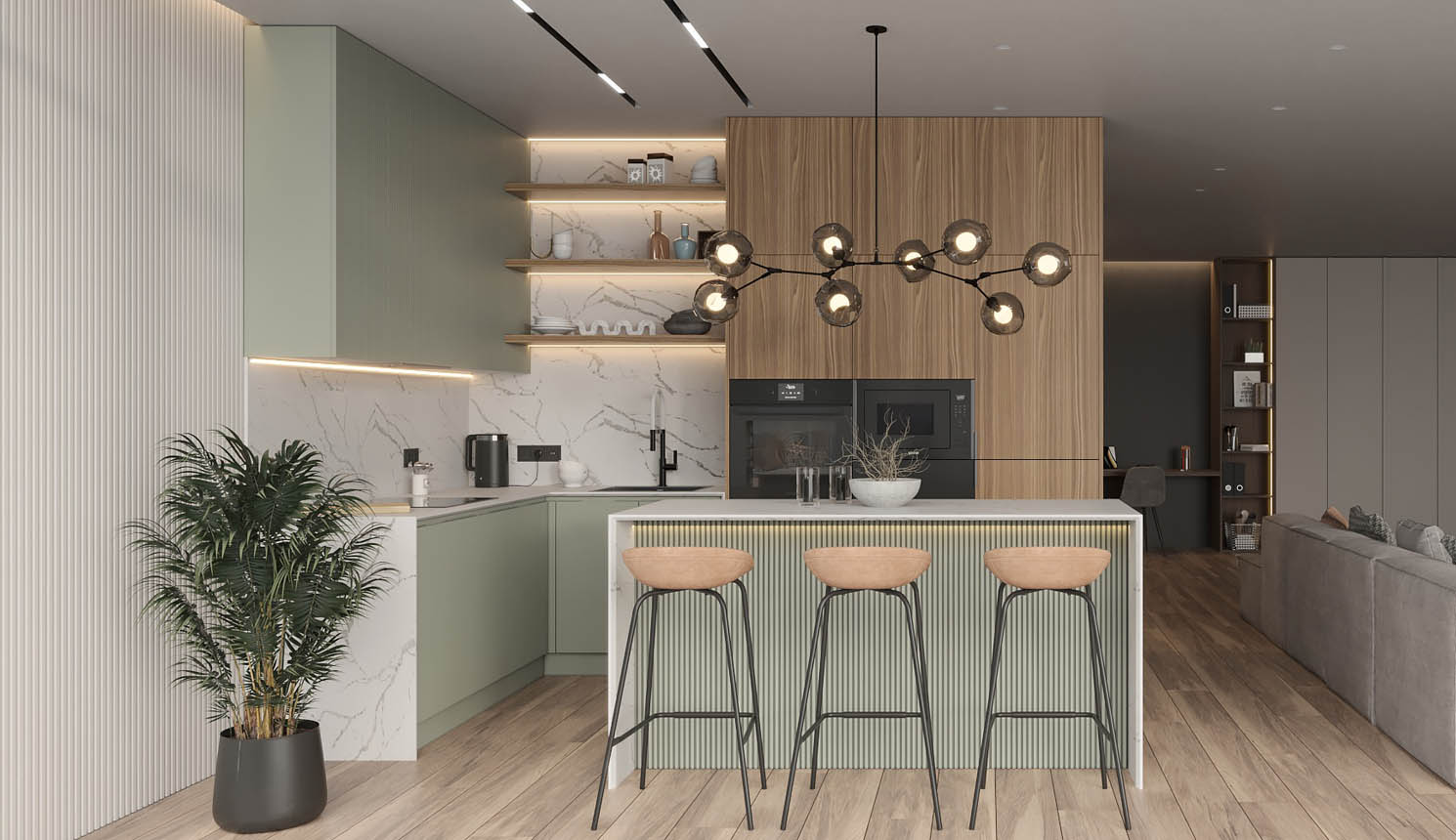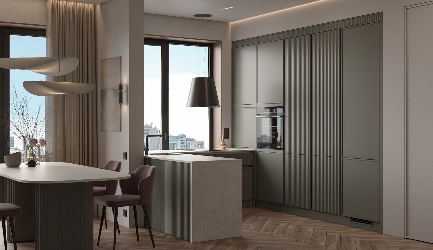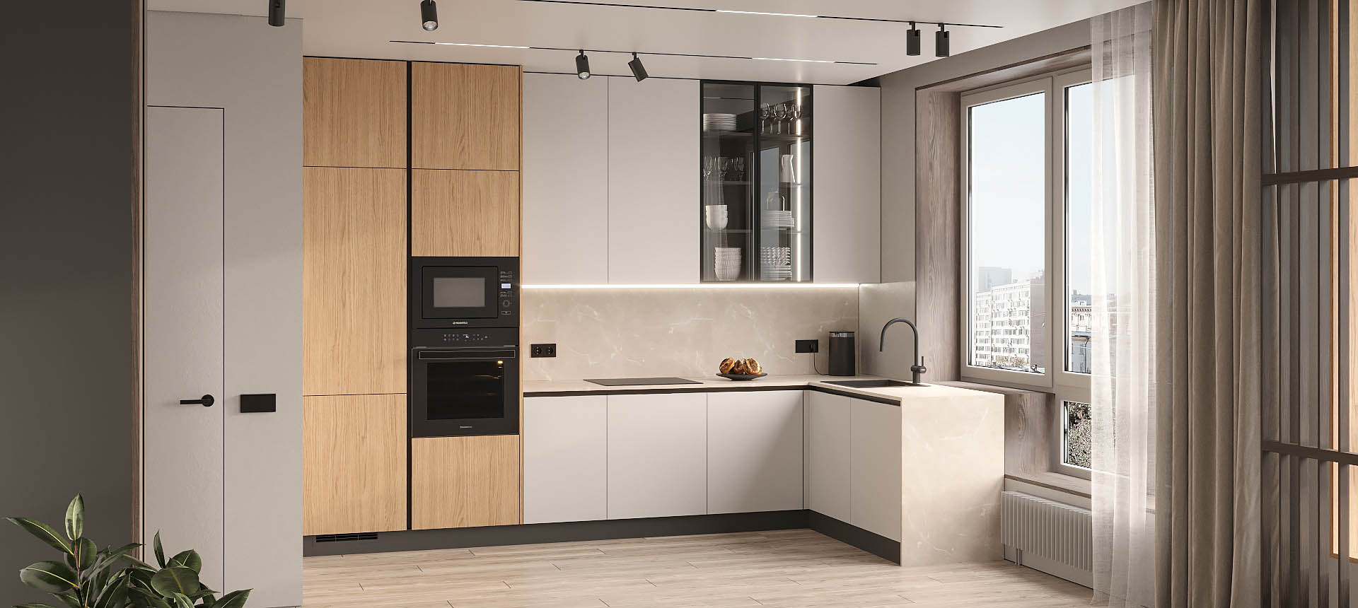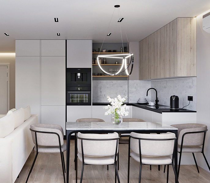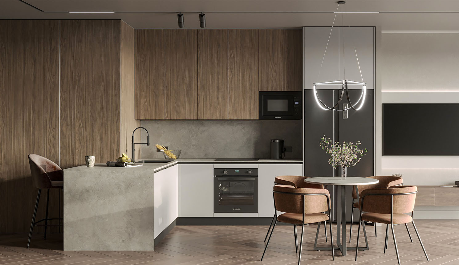 В этом году в тренде современный и скандинавский стили, неоклассика и минимализм. В моде серые, белые, бежевые, пастельные кухни с ненавязчивыми акцентами. Актуальны имитация фактур под дерево, бетон, камень, керамику, матовые поверхности, фасады без ручек и декора, кухни-трансформеры. Подробнее о трендах дизайна 2023 года можно прочитать в статье.