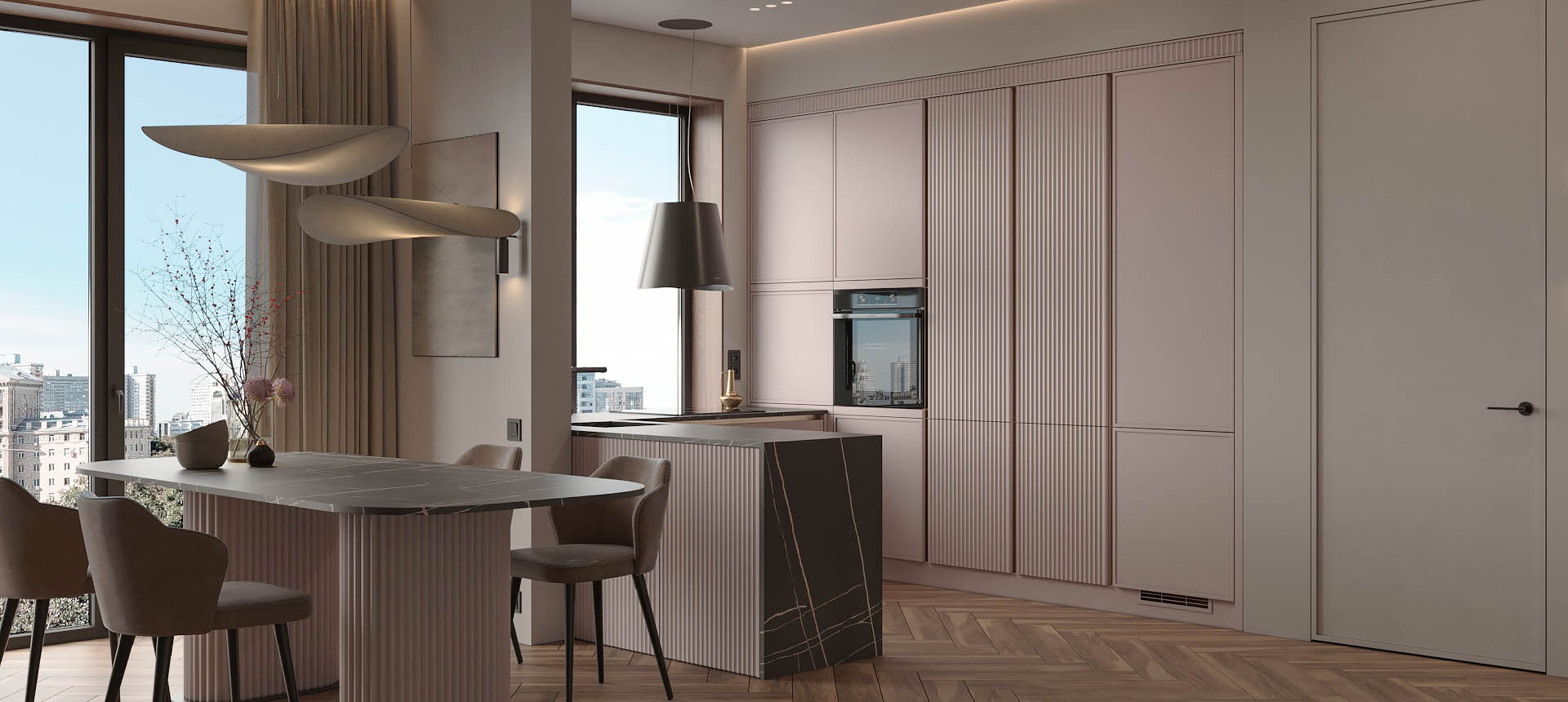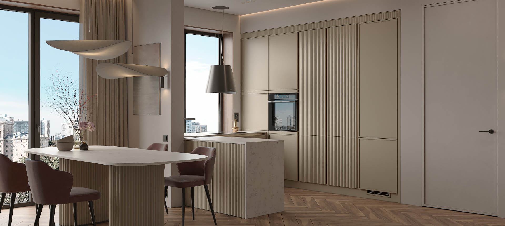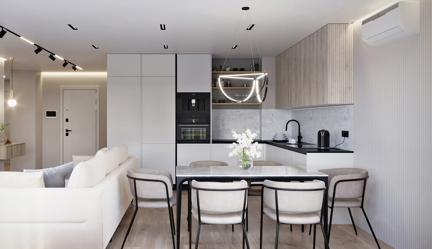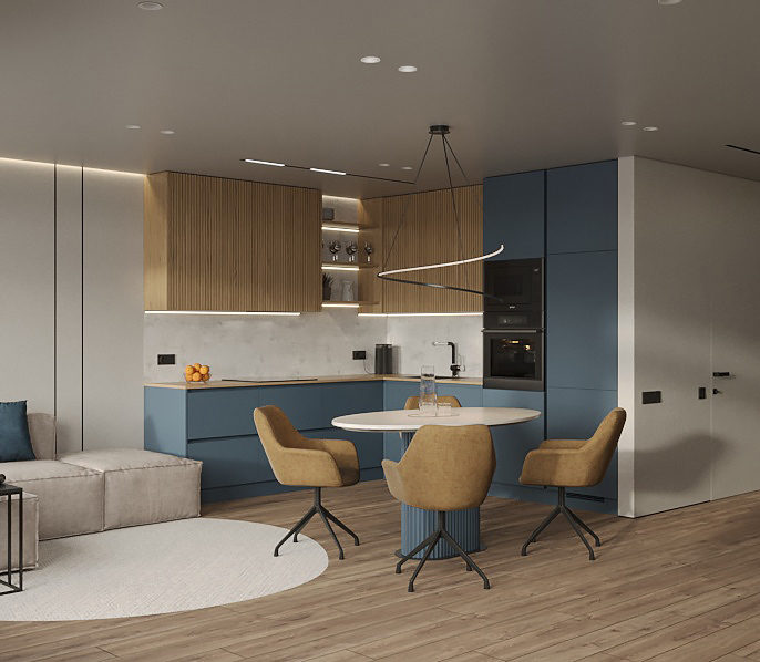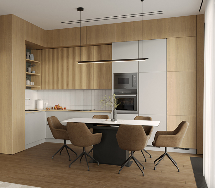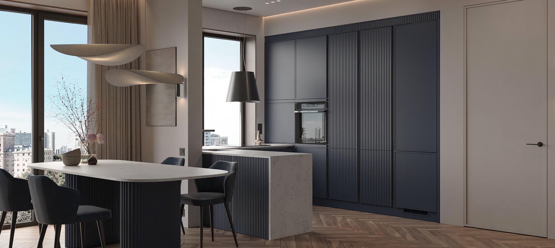 В этом году в тренде современный и скандинавский стили, неоклассика и минимализм. В моде серые, белые, бежевые, пастельные кухни с ненавязчивыми акцентами. Актуальны имитация фактур под дерево, бетон, камень, керамику, матовые поверхности, фасады без ручек и декора, кухни-трансформеры. Подробнее о трендах дизайна 2023 года можно прочитать в статье.
