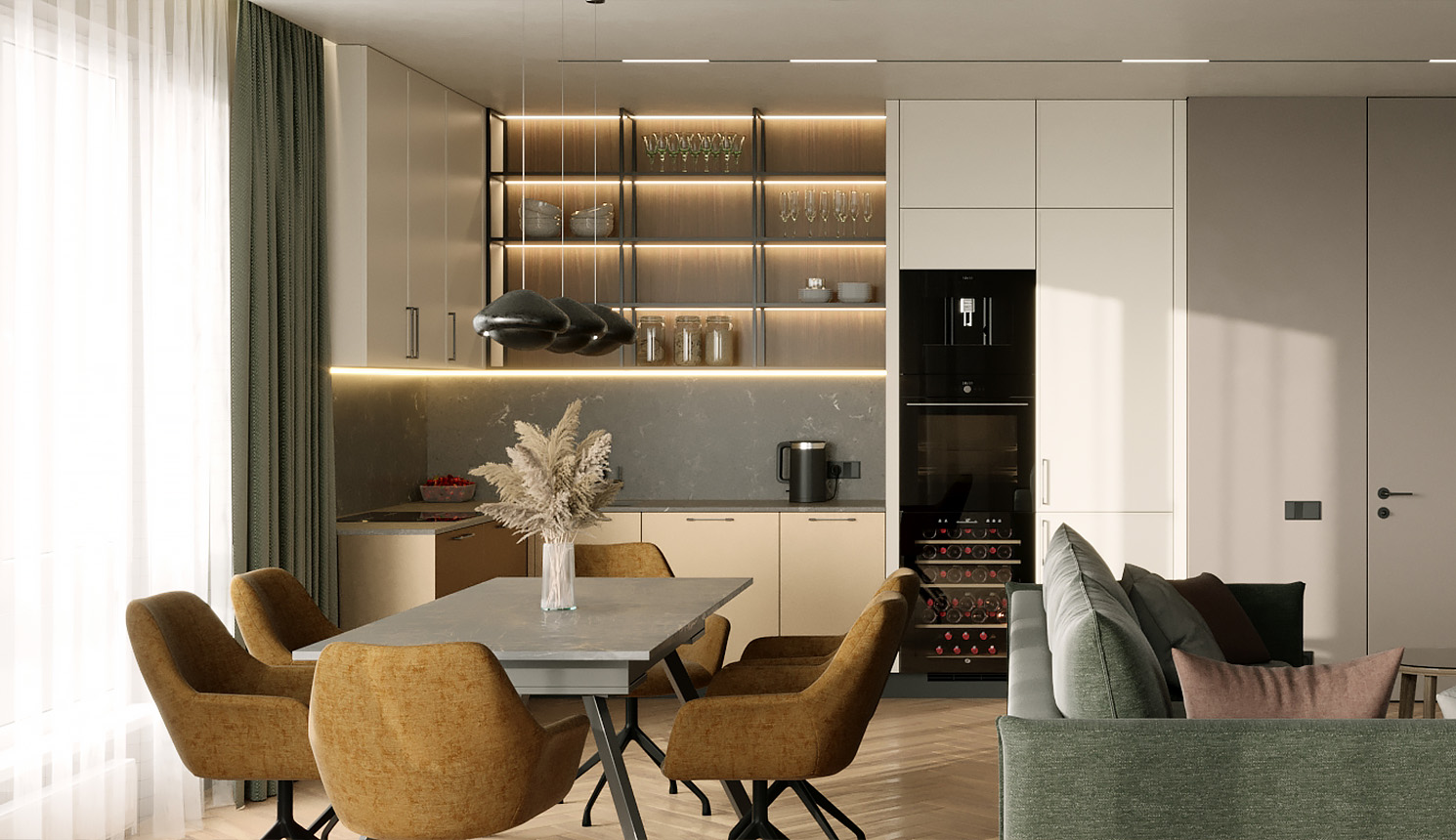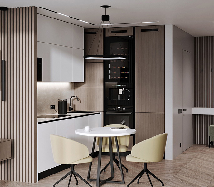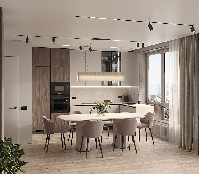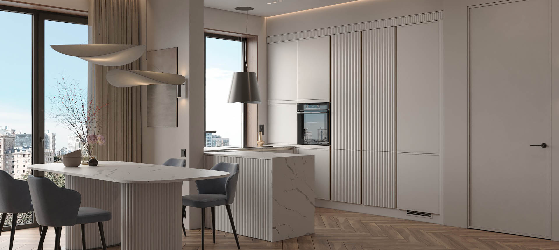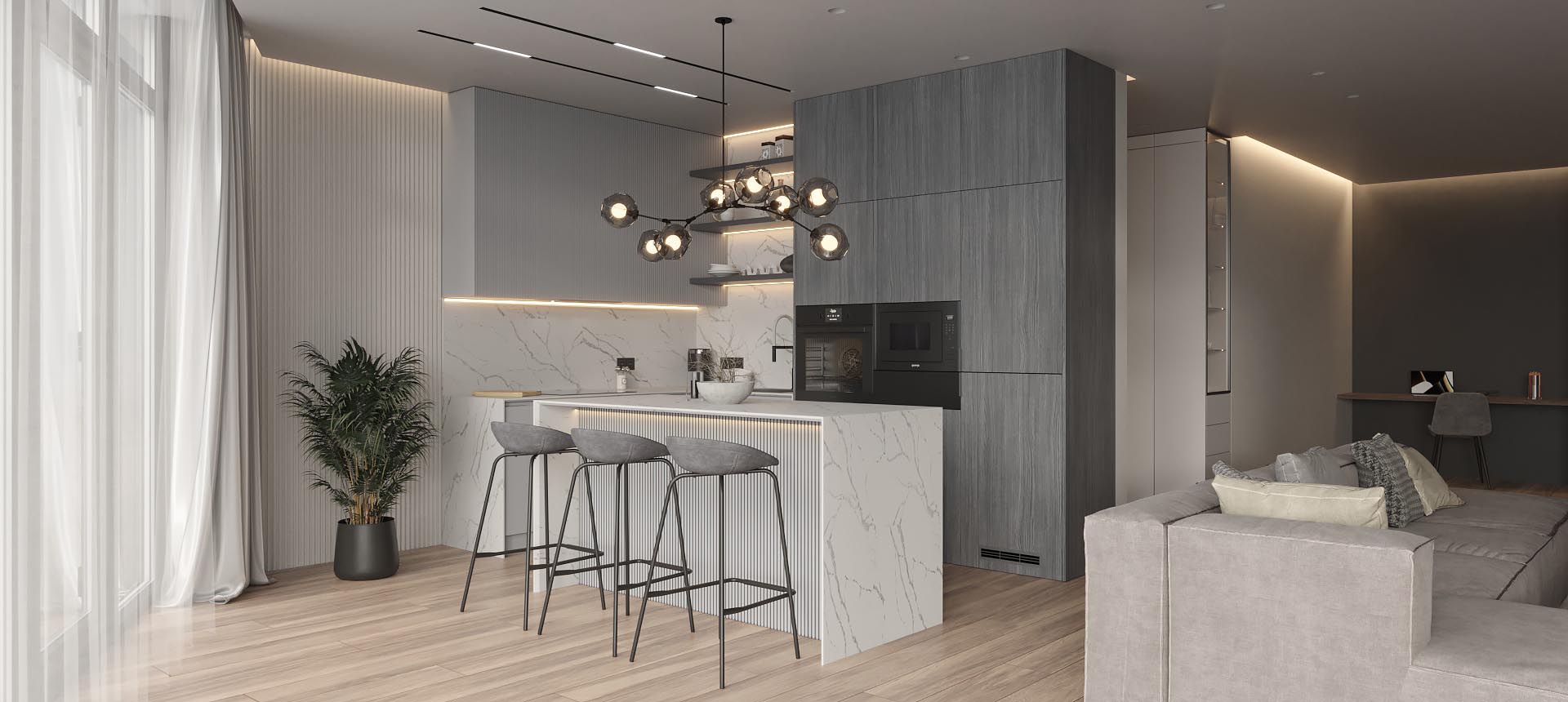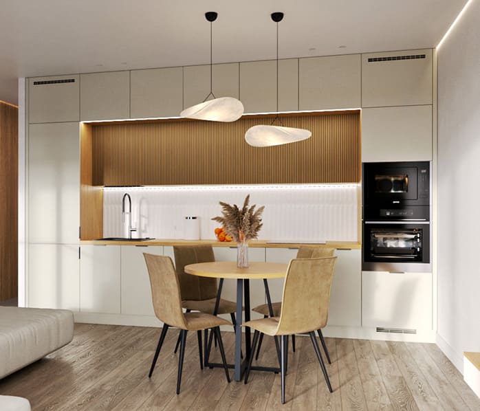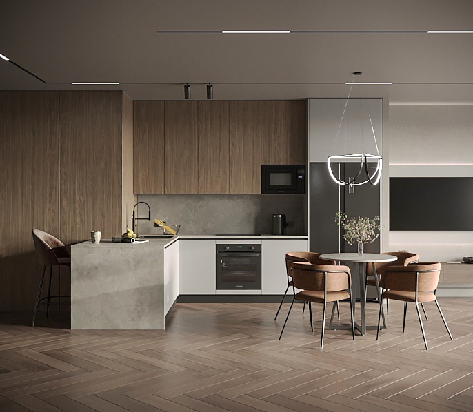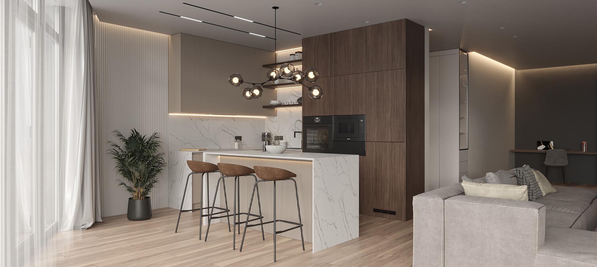 В этом году в тренде современный и скандинавский стили, неоклассика и минимализм. В моде серые, белые, бежевые, пастельные кухни с ненавязчивыми акцентами. Актуальны имитация фактур под дерево, бетон, камень, керамику, матовые поверхности, фасады без ручек и декора, кухни-трансформеры. Подробнее о трендах дизайна 2023 года можно прочитать в статье.