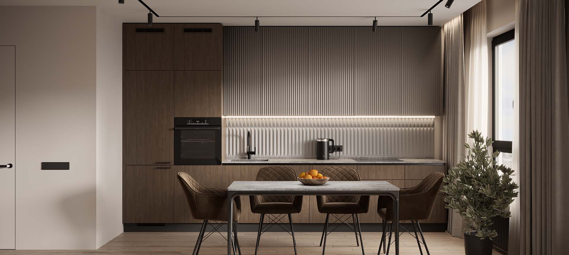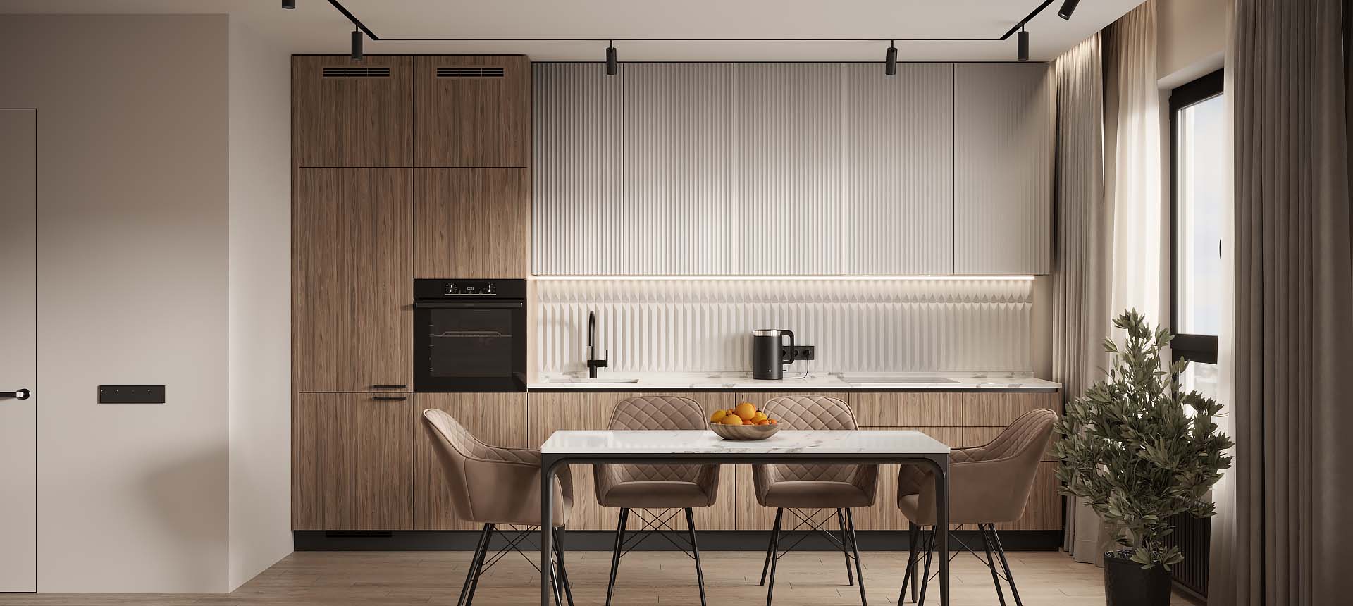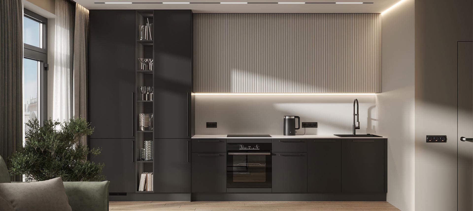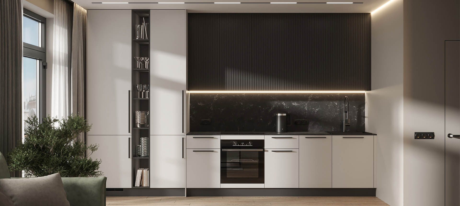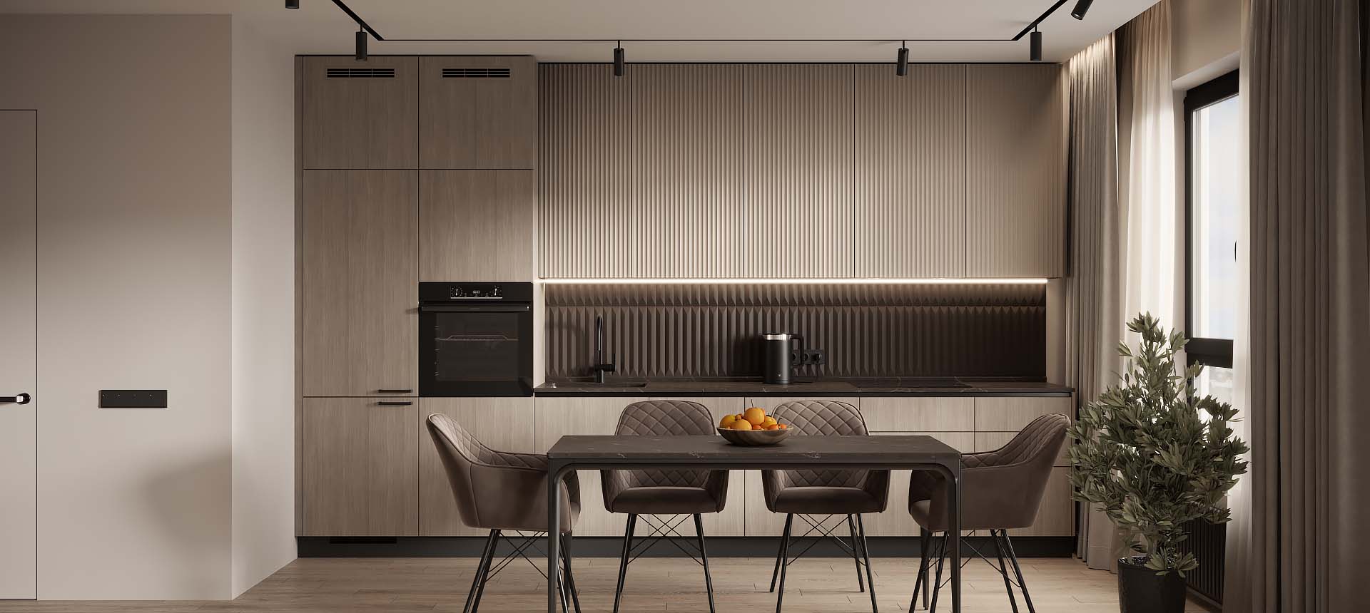 Чтобы дизайнер бесплатно создал проект прямой кухни с учётом ваших пожеланий по планировке, цвету, наполнению.