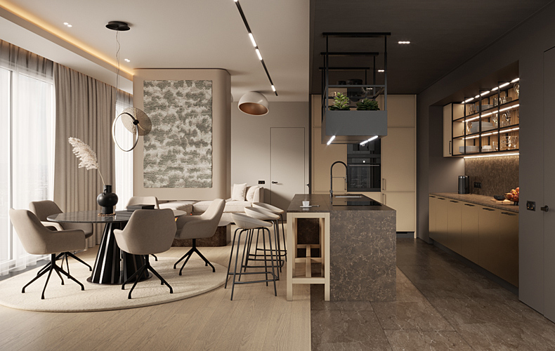 Кухонный гарнитур Ренцо 16 представлен большой п-образной кухней с барной стойкой, высокими встроенными шкафами и элементами из металла. В мебельных колонках установлена встраиваемая духовка, холодильник, винный шкаф и кофемашина. На полуостров вынесена варочная поверхность, а с ней и навесная вытяжка. Мойка со смесителем располагаются в рабочей зоне под секцией открытых полок. Используется локальная подсветка зон.