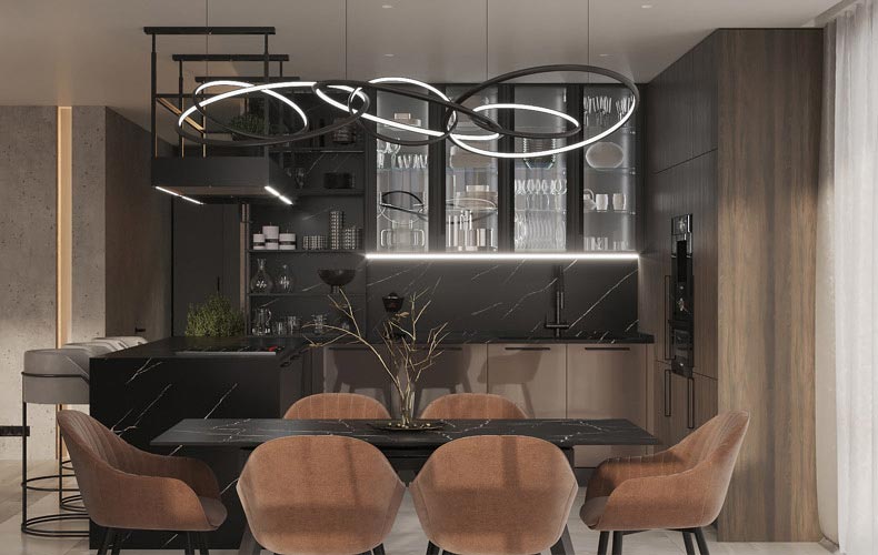 На остров вынесена зона приготовления со встроенной кухонной техникой, которая представлена варочной поверхностью и духовым шкафом. Остров также оснащен большим количеством ящиков разной высоты. С внешней стороны острова располагается барная стойка с барными стульями и в дополнение подвешены современные светильники.