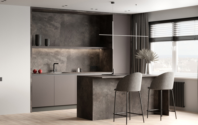 Кухонный гарнитур Тинто П-образной конфигурации с вынесенной на полуостров варкой. Кухня имеет блок с колонками под технику и холодильник; нижние шкафы с рабочей зоной, мойкой и варкой; навесные шкафы с дверцами из стекла в алюминиевой черной рамке и открытые элементы, также выполненные в черном цвете. Древесный декор колонок представляют фасады «Маттео», остальные шкафы представлены фасадами «Тинто» в насыщенном кофейном цвете. Кухонный гарнитур имеет большое количество ящиков, полок и систем хранения, подсветку рабочей зоны и навесных стеклянных шкафов. Полуостров представляет собой функциональный элемент мебели - есть и варочная поверхность с навесной вытяжкой, и шкафы с ящиками и пространство для барной стойки.