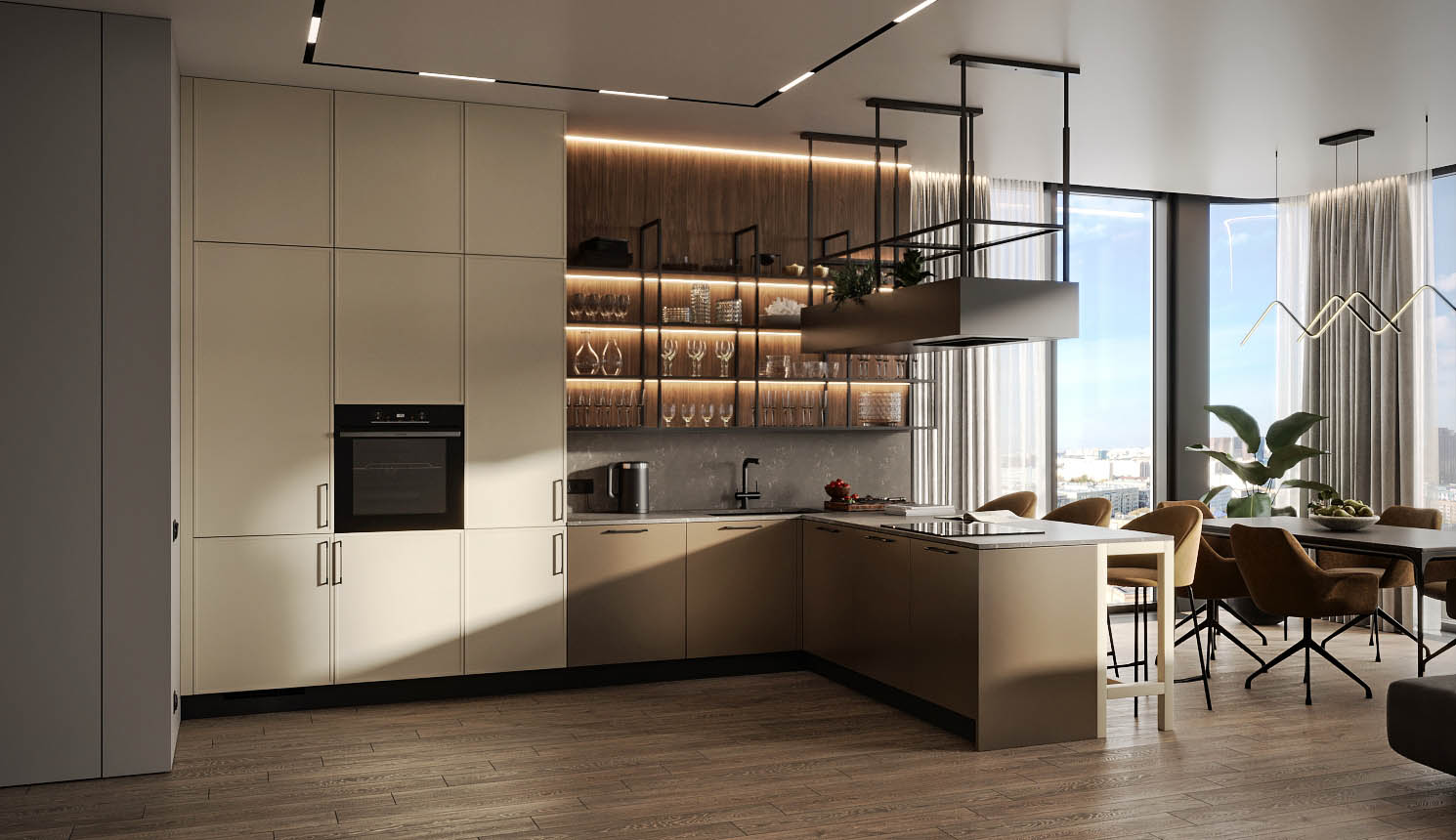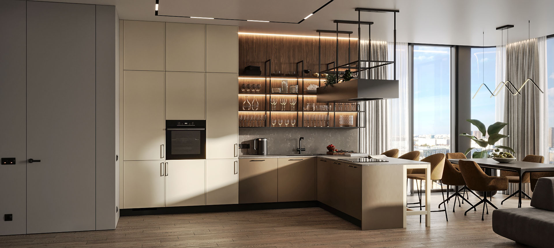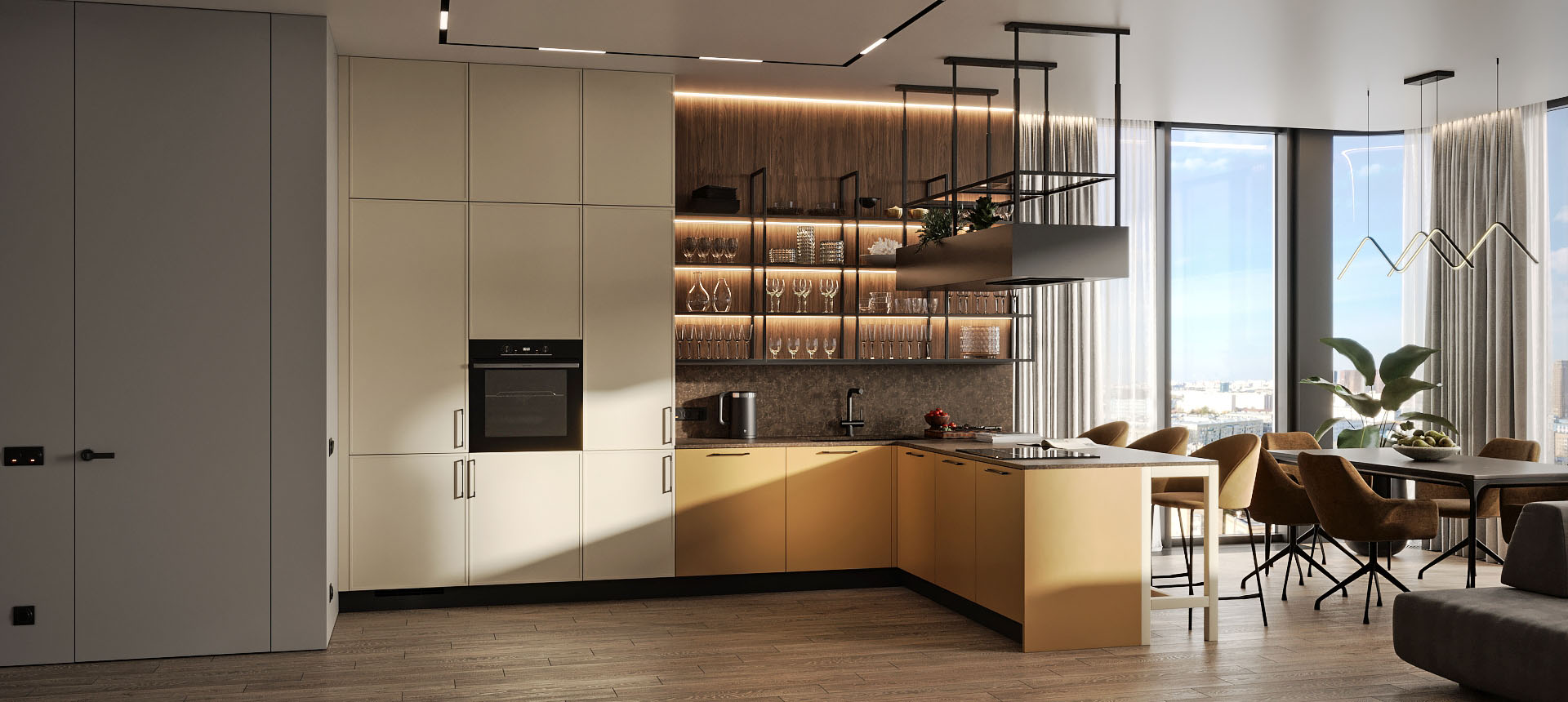 • Красивая кухня с золотыми акцентами в двухкомнатной квартире бизнес-класса