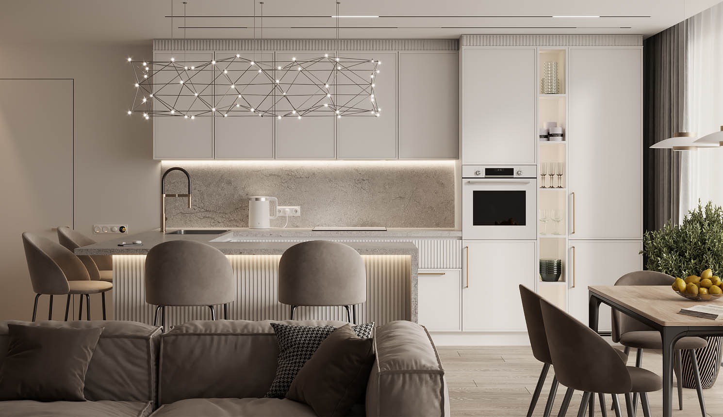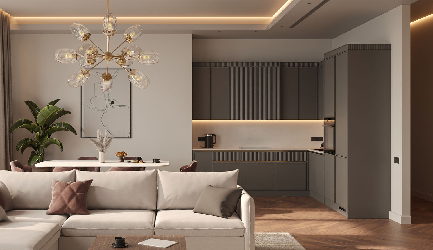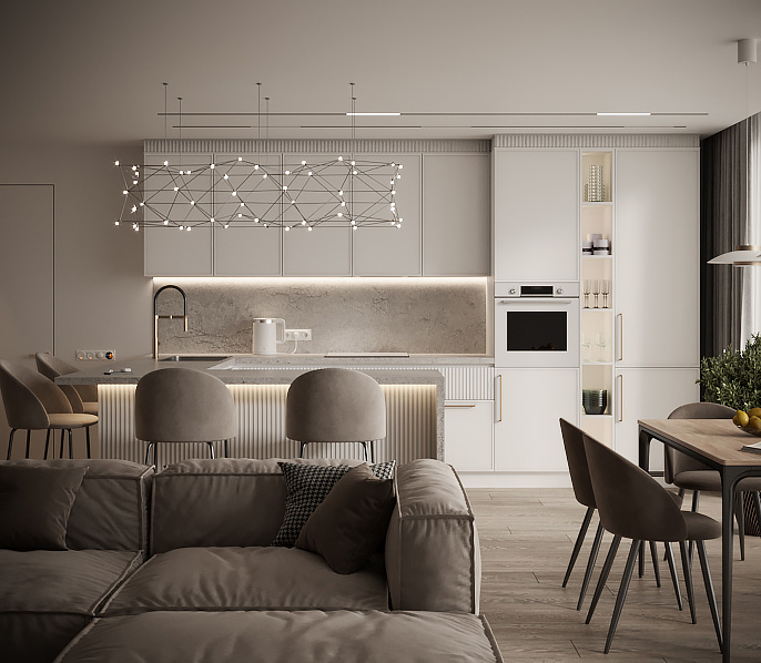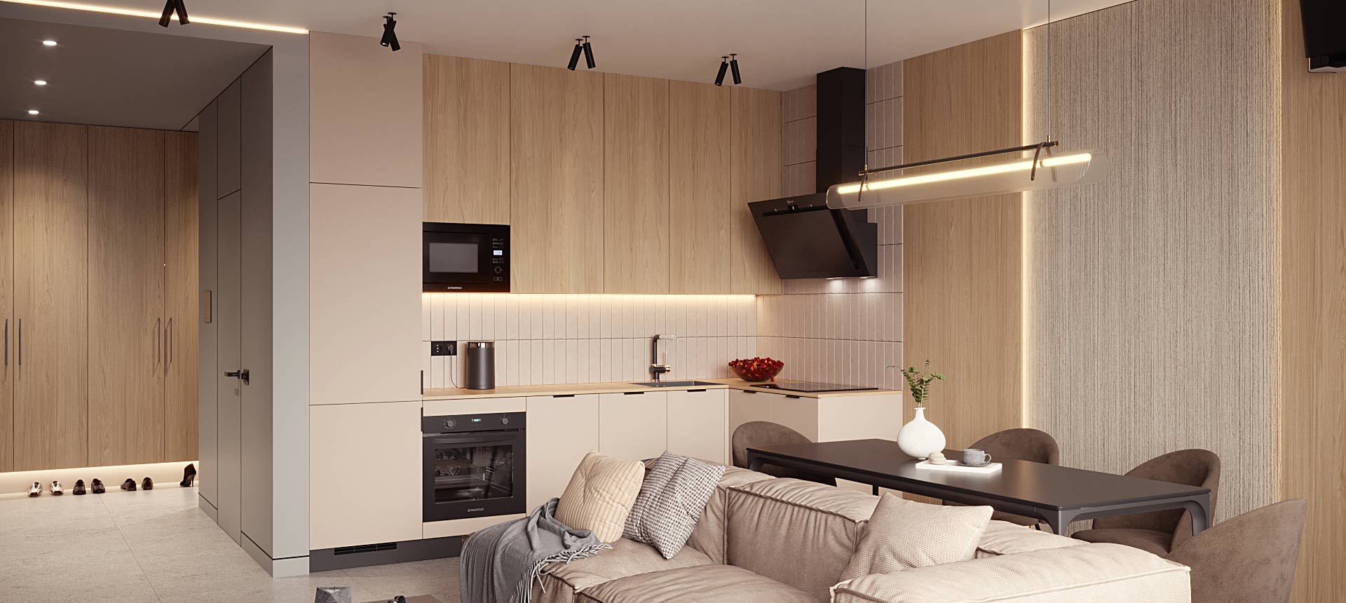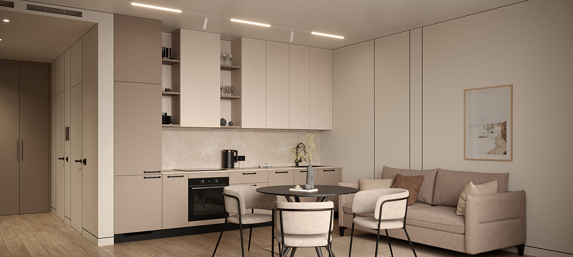Светлая функциональная квартира в бежевых тонах для семьи из трех человек