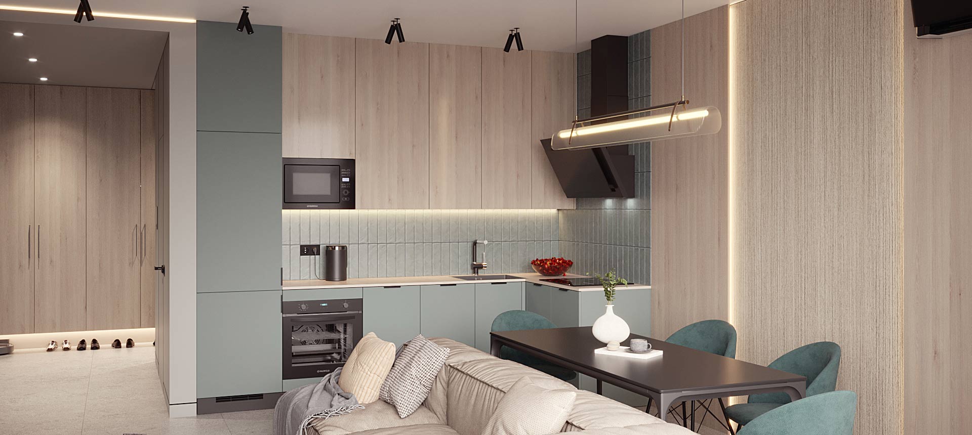 Угловая кухня и большая прихожая для молодой московской семьи в двухкомнатной квартире