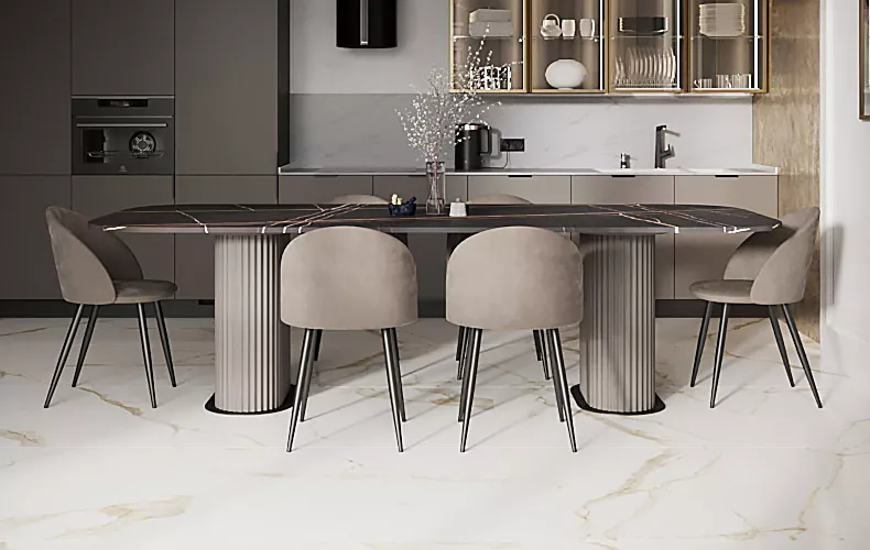 Объемная фрезеровка опоры в сочетании с суперматовой отделкой или отделкой с текстурой, рождает ассоциацию с тканью вельвет. Благодаря тому, что тонкая столешница устанавливается на подложку, удалось добиться визуальной легкости, при этом не потеряв в показателях прочности. Нижнее металлическое основание уравновешивает композицию и добавляет еще больше устойчивости. Столешницу можно заказать в таких материалах как искусственный камень, компакт-плита, кварцевый агломерат или HPL-пластик.