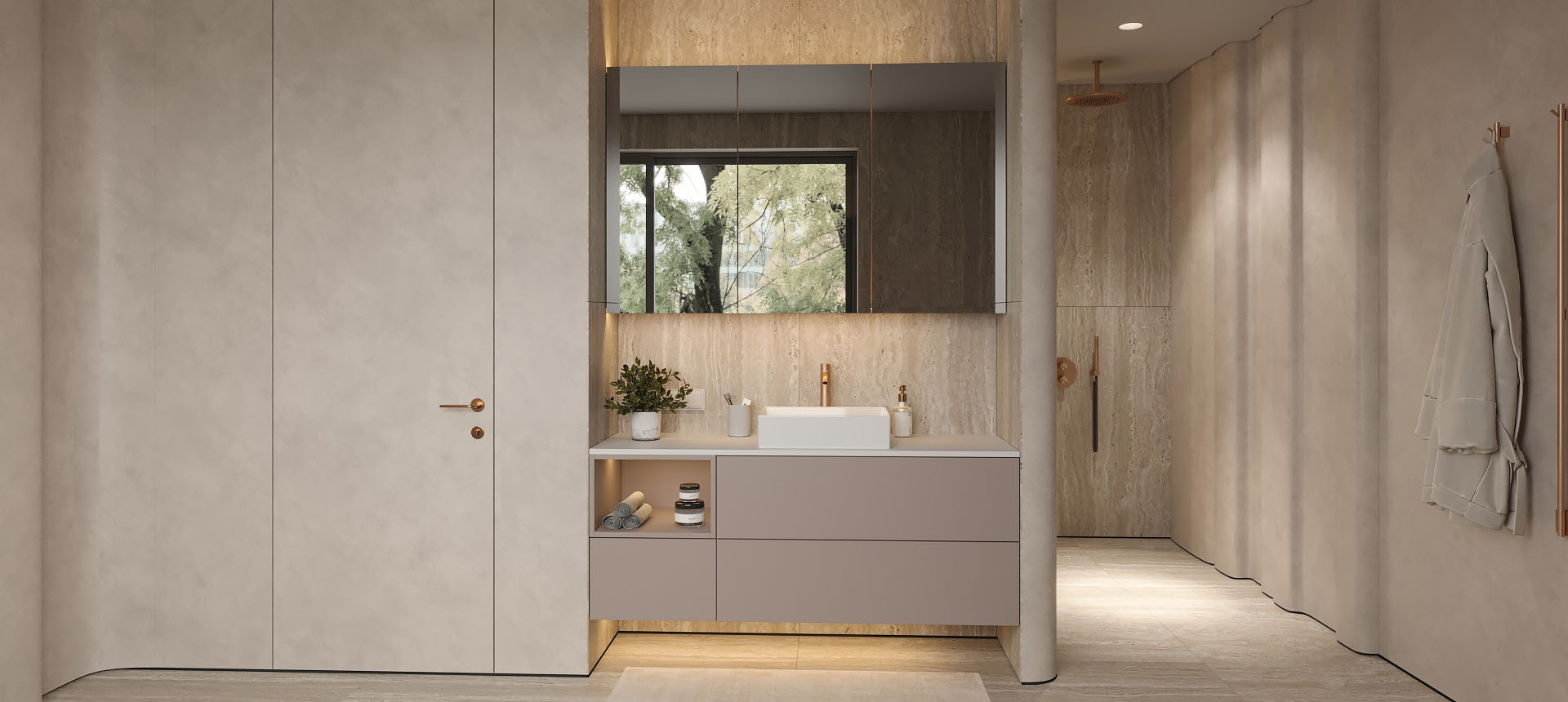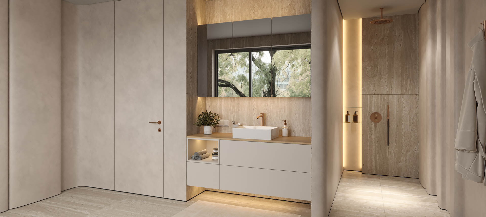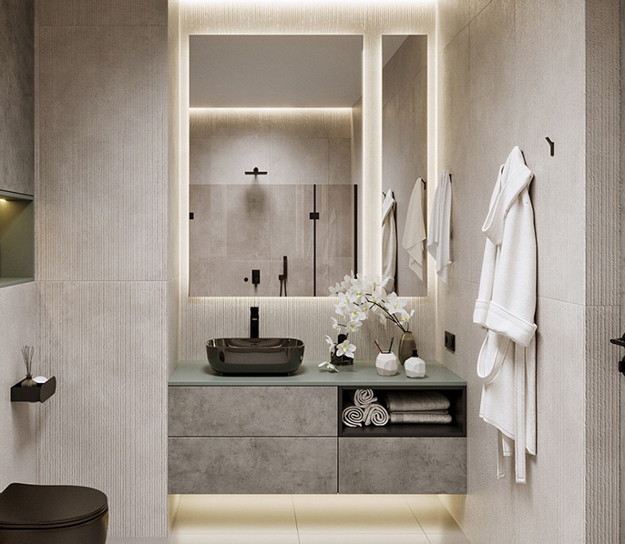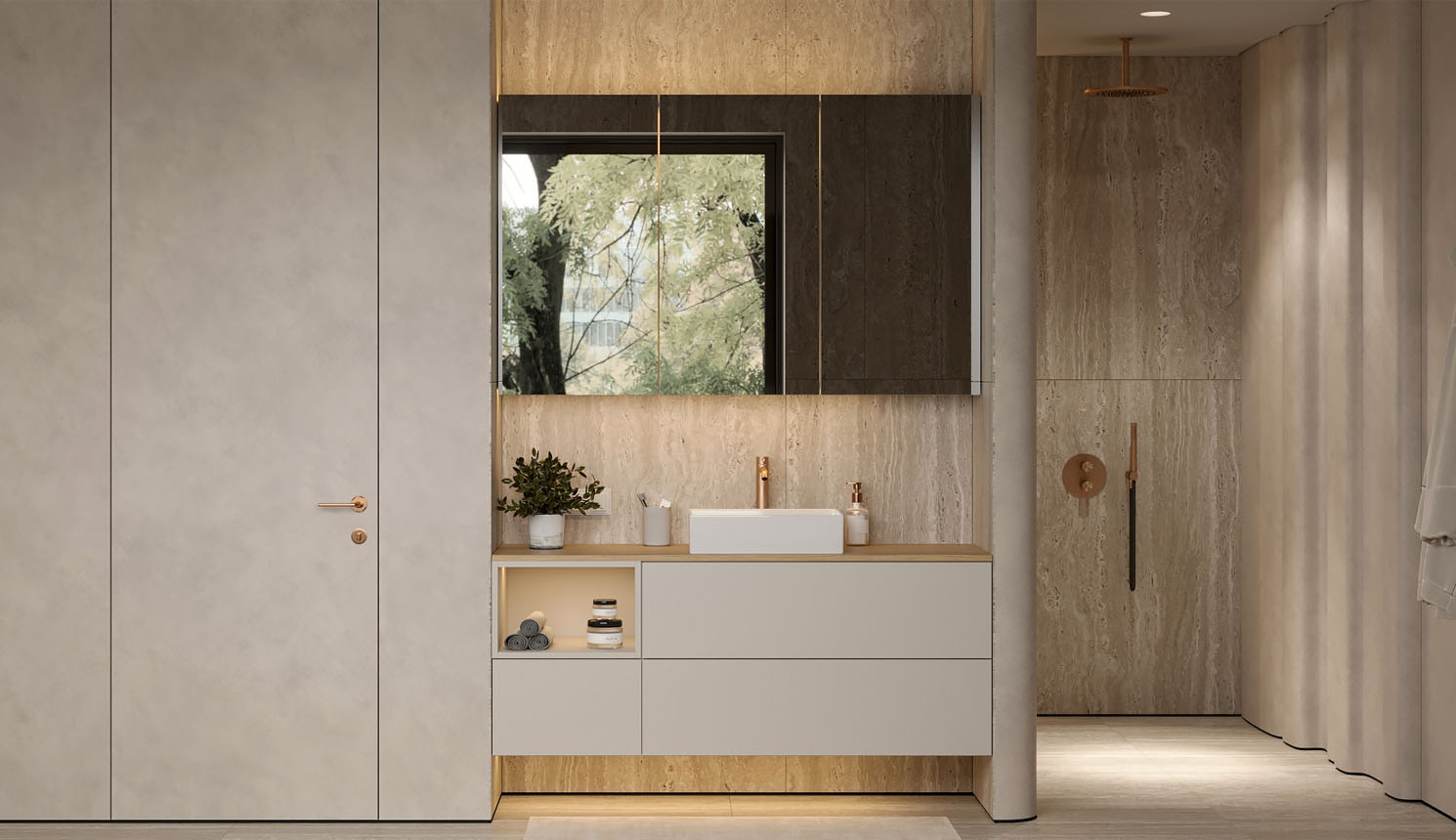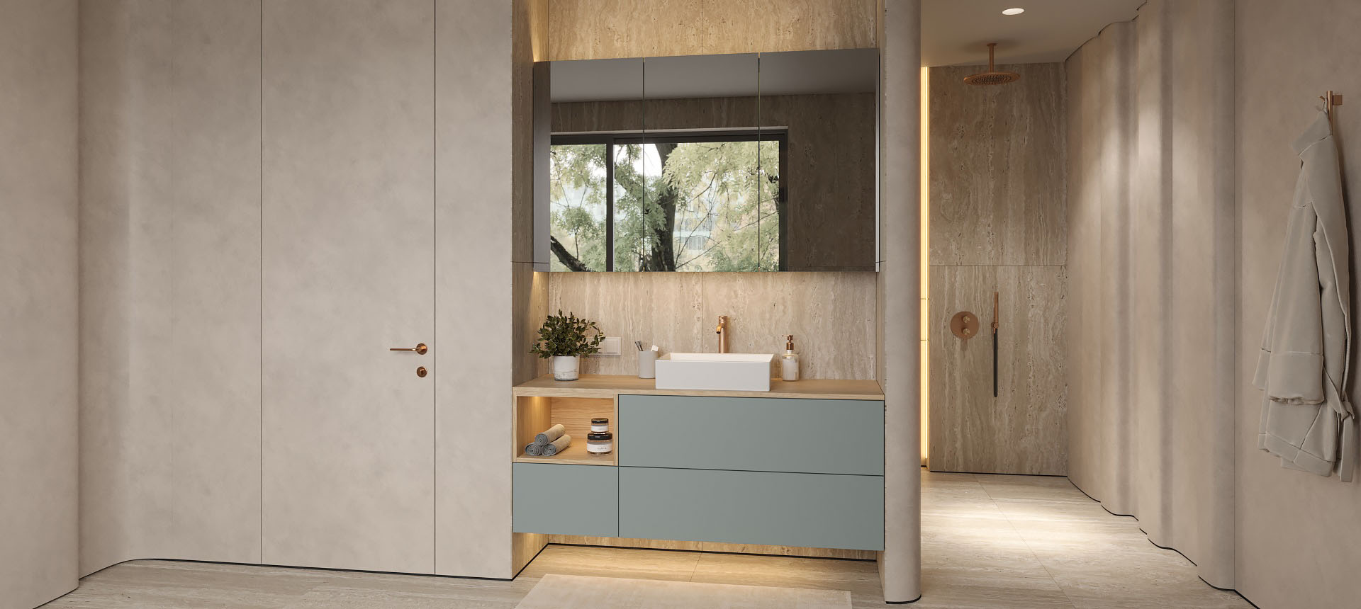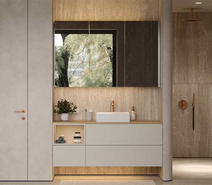 «У меня все проекты с компанией («Стильные Кухни и Интерьеры) были хорошие, но мебелью в ванную комнату я довольна больше всего на свете. Мне сделали тумбу под раковину, две навесные колонки по бокам, зеркало с подсветкой, а также встроенный шкаф напротив. Из-за высоты потолков и размеров шкафов было непросто спроектировать все так, как надо: были опасения, что дверцы ослабнут, что тяжелые дверцы нельзя будет открывать одним легким нажатием. Но в итоге в фасады добавили направляющие, которые их усиливают. И еще удалось сделать эти высокие двери с механизмом push-to-open. У меня не очень большая площадь ванной, поэтому хотелось обойтись без лишних деталей, в том числе и выступающих ручек, которые я бы постоянно задевала»,